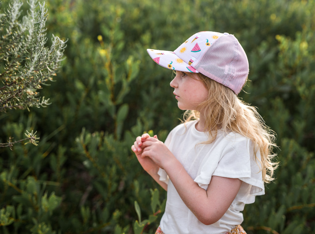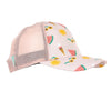 Trucker cap with a pink based beach inspired print of ice-creams, watermelons, suns and glasses on peak and visor.