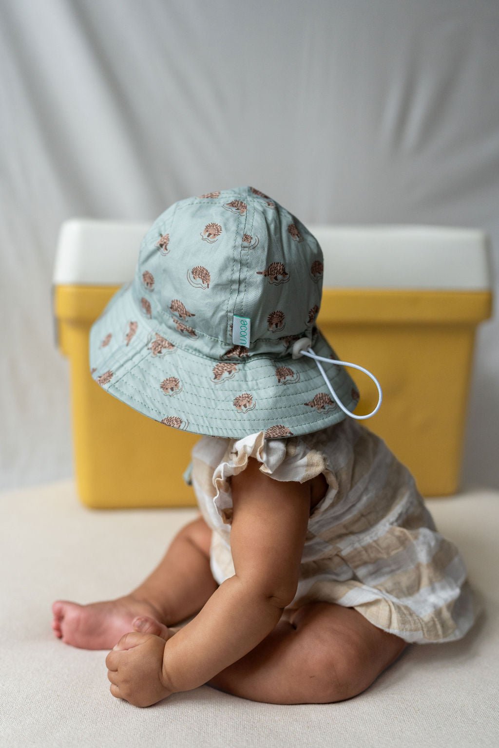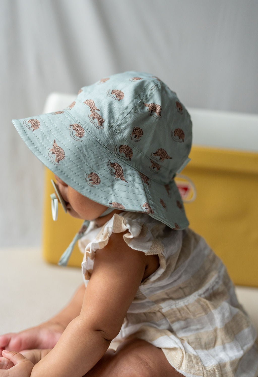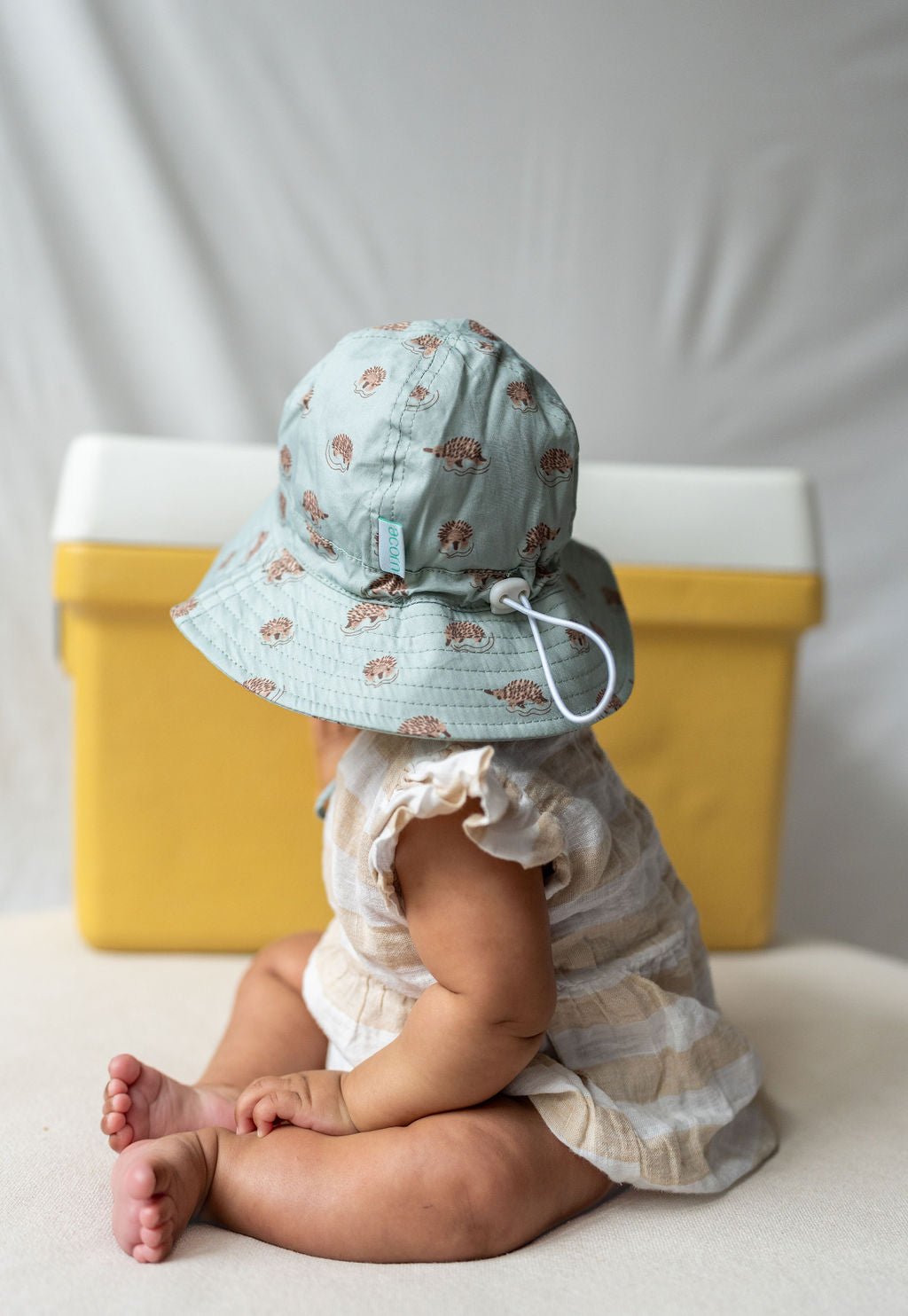 Baby sun hat with a fun Echidna print designed in Melbourne by Jacinta Weir from Two Little Ducklings.