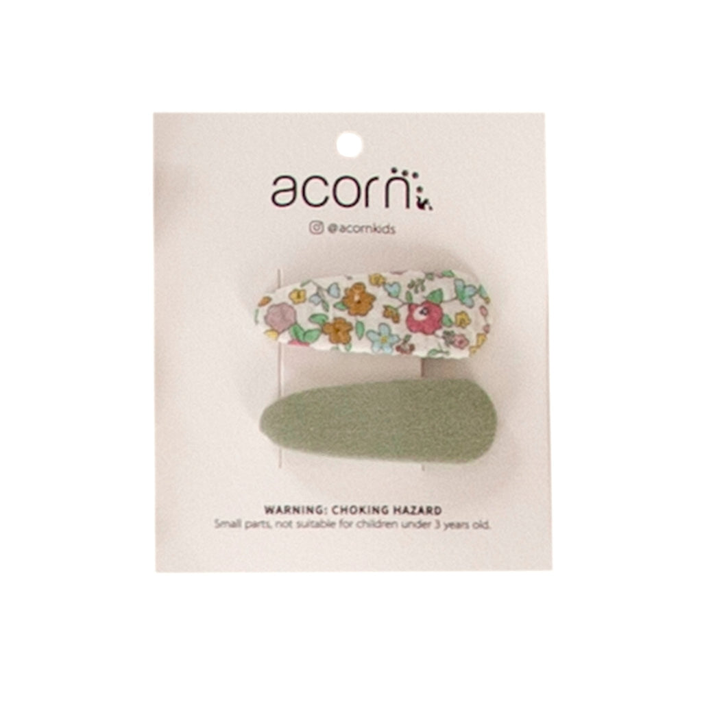 Pretty hair clip with a ditsy flower fabric design and a plain sage fabric design and snap closure.