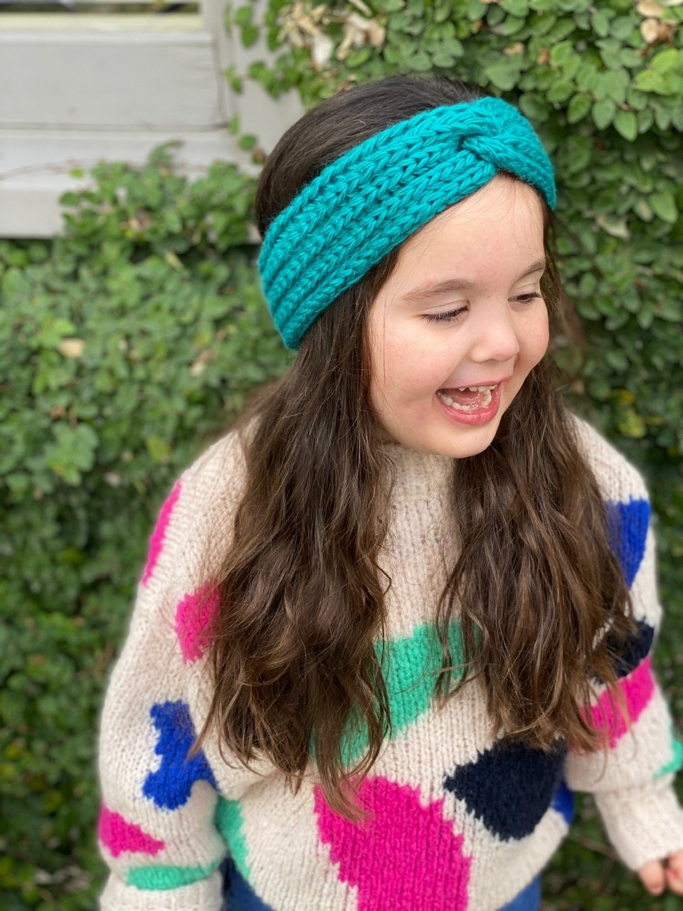 Keep little ears warm and toasty this winter with this hand-knitted head wrap. Made with a ribbed stitch and cross over feature at the top of the head