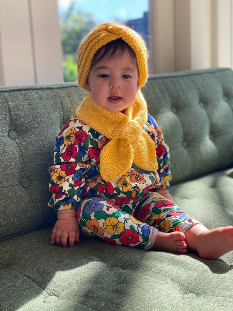 Keep little ears warm and toasty this winter with this hand-knitted head wrap. Made with a ribbed stitch and cross over feature at the top of the head