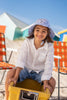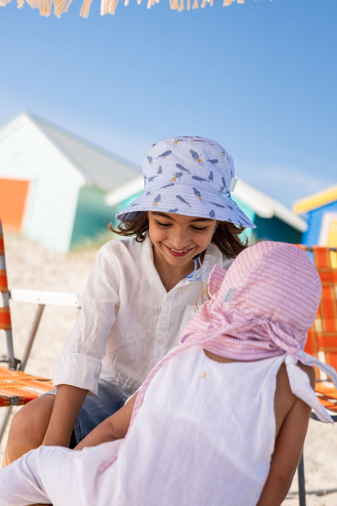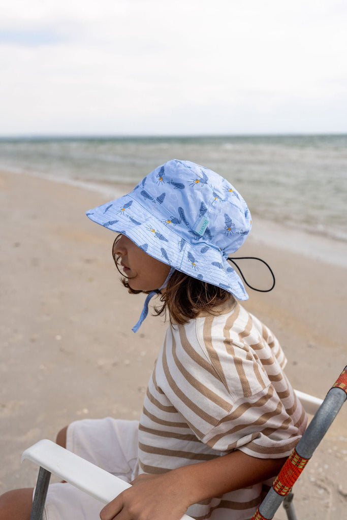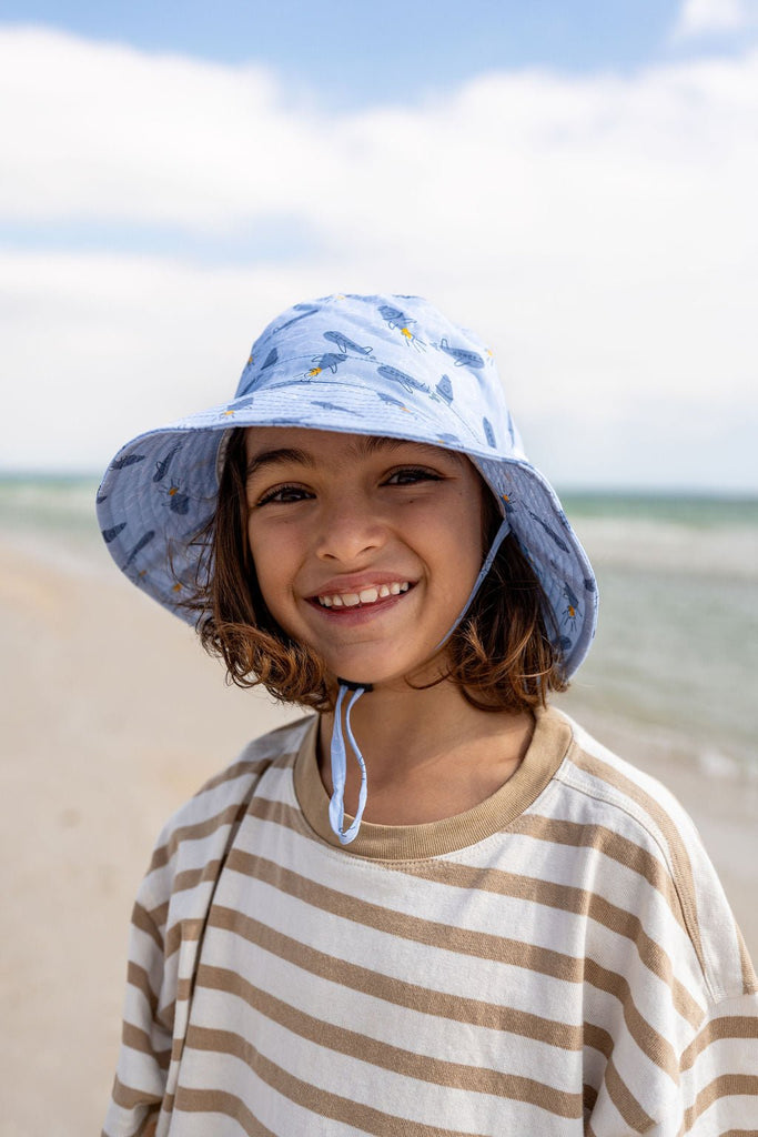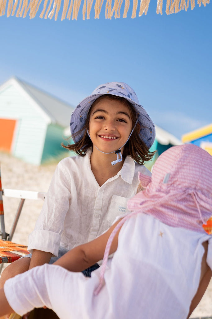 Blast into summer in style with this a super cool rocket ship print on the outside and inner brim. The original artwork was designed in Melbourne by artist Jacinta Weir.