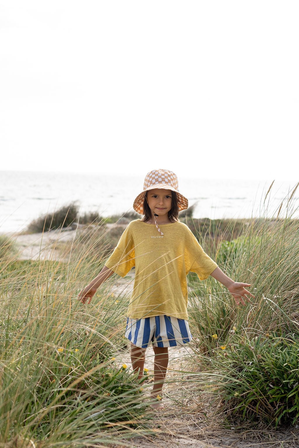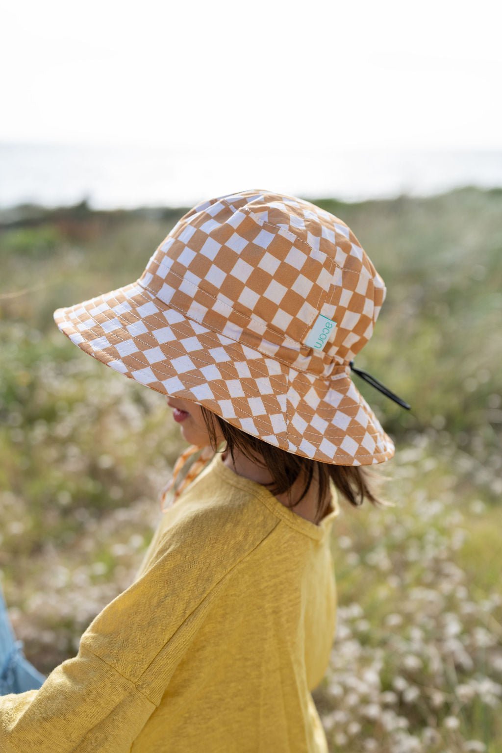 Let the summer fun begin, with this super cool caramel and cream checks print on the outside and inner brim. The original artwork was designed in Melbourne by artist Jacinta Weir.