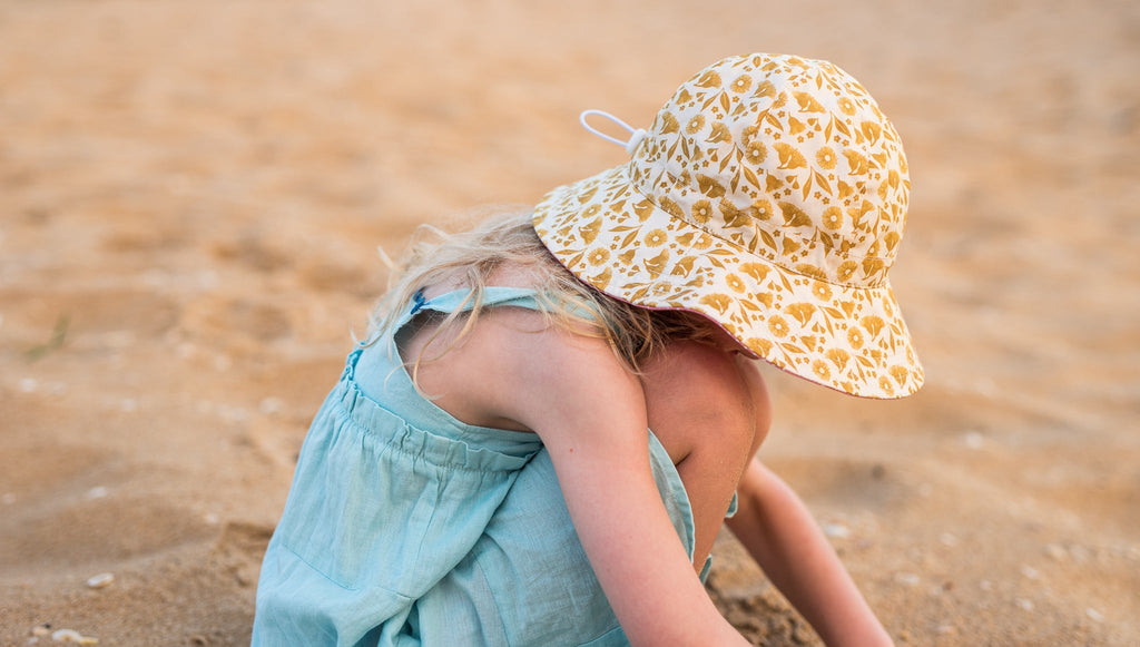 The Fields of Gold Wide Brim Sunhat is the perfect hat to go with everything this summer. A stunning golden Australian native flora print on the outside and a pink and white polka dot print in the inner brim.