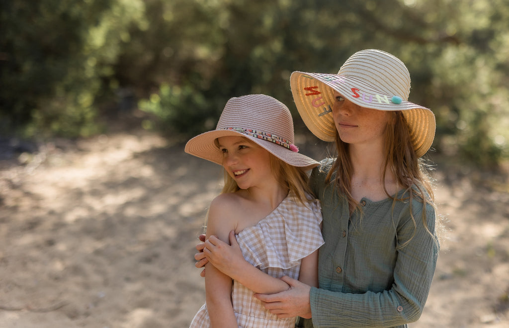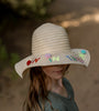 This adorable hat features colorful text and playful pom poms around the brim for a fun pop of style. With a comfy inner sweatband to keep it snug in place and a wide brim for extra sun protection, it's made for sunny days.