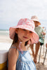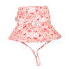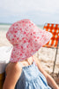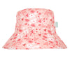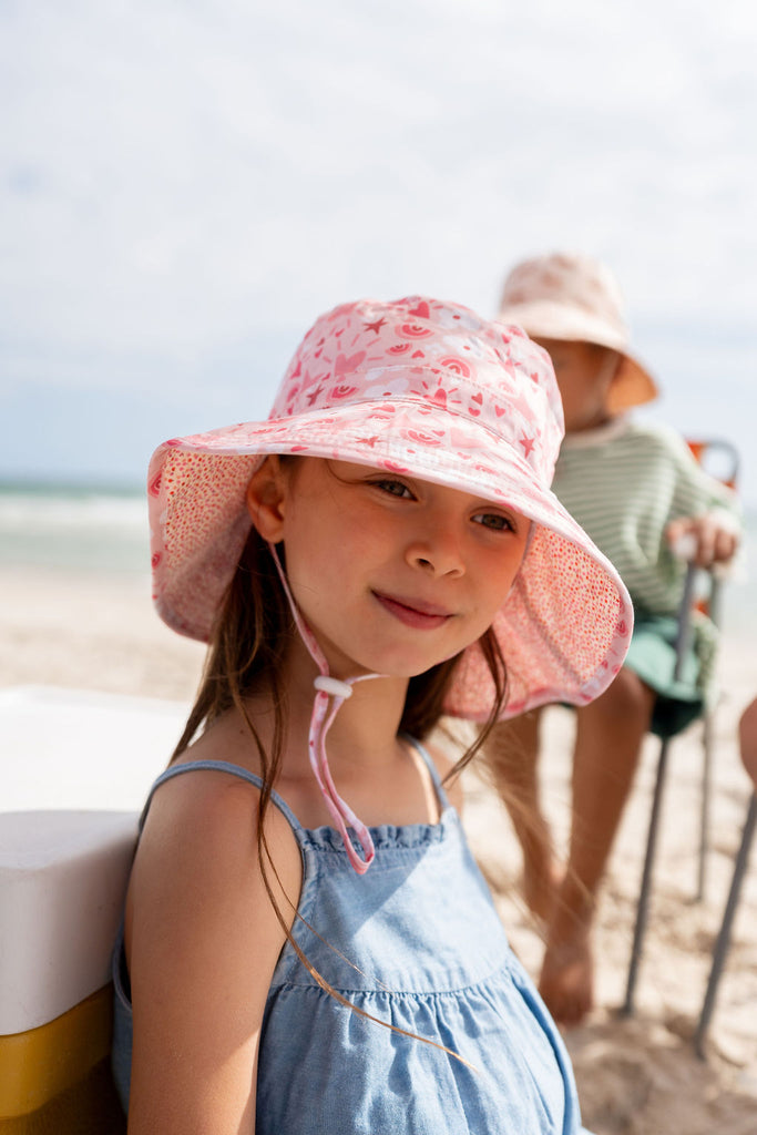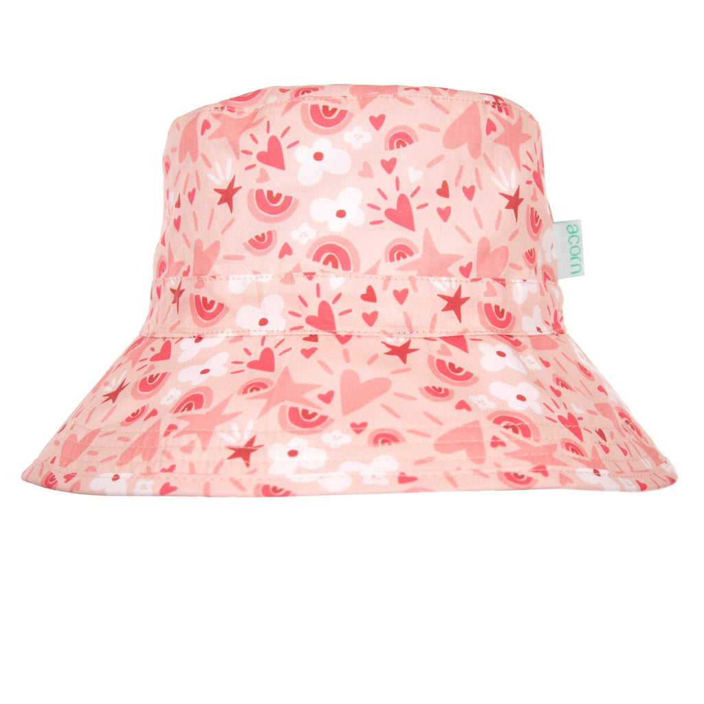 Bucket hat with a sweet pink based love hearts, flowers and rainbows print on outside and a pink and cream spot on the inner brim.