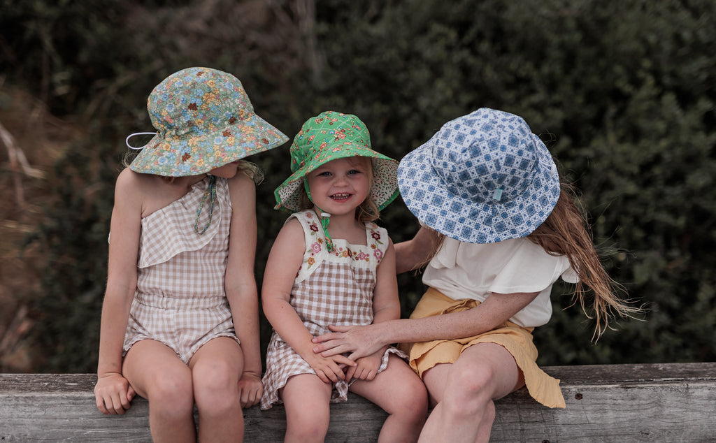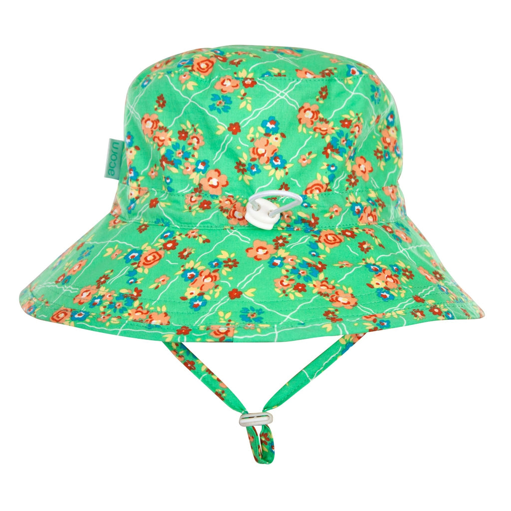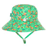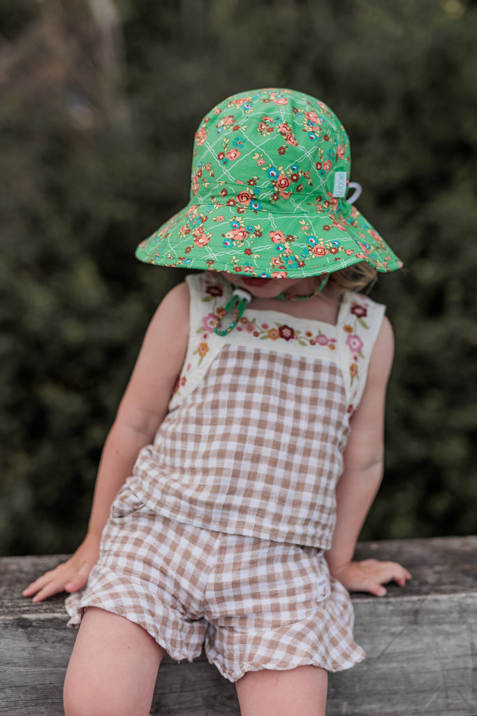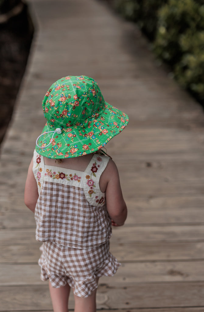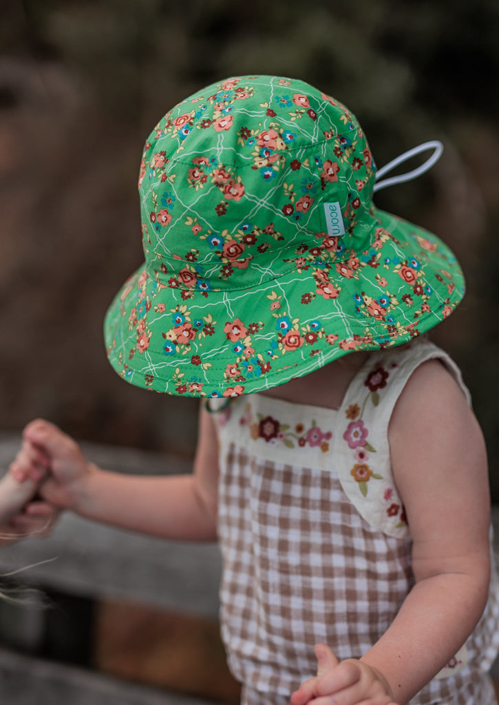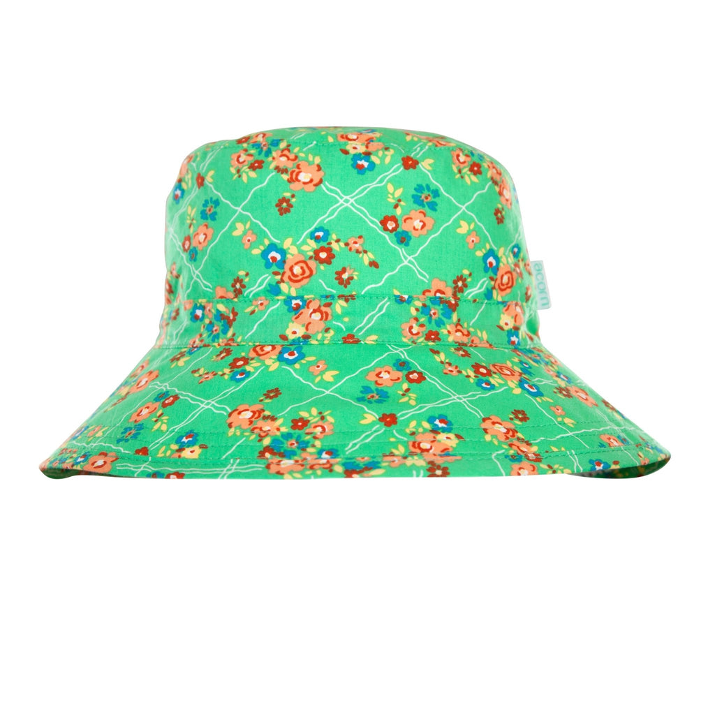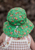 Bucket hat with a stunning green vintage inspired floral print on outside and a cream based multi-coloured sprinkles print on the inner brim.