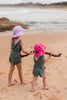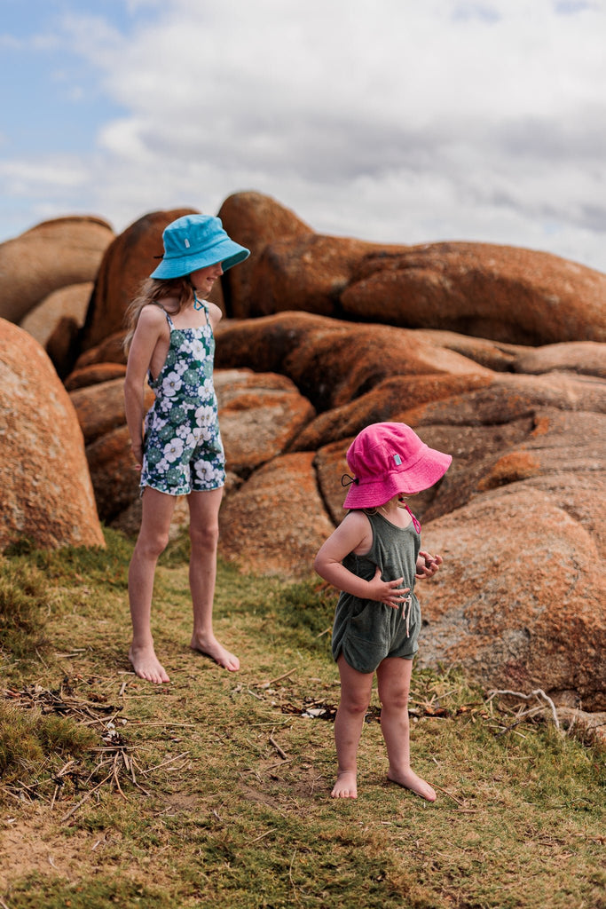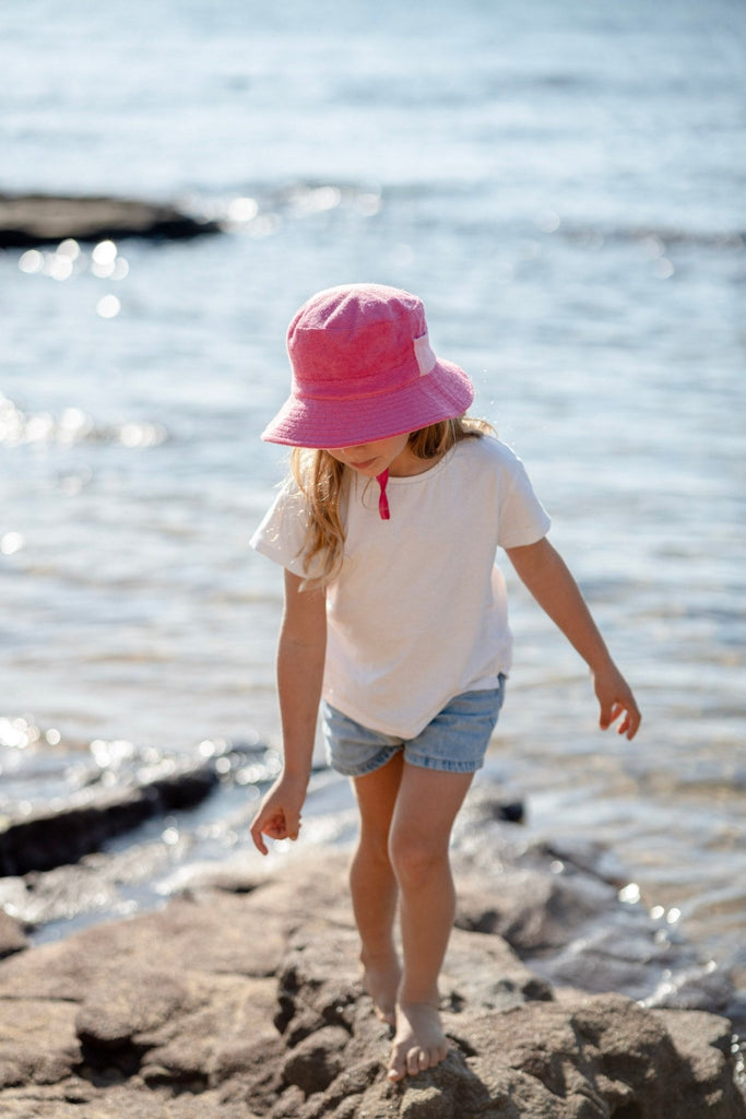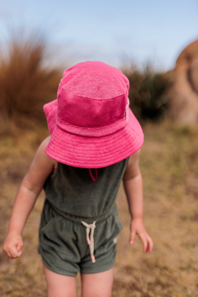 A fun terry towelling bucket hat in hot pink with a light pink contrast pocket on the side is giving all the cool retro vibes and a dash of Barbie-inspired fun.