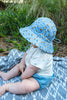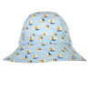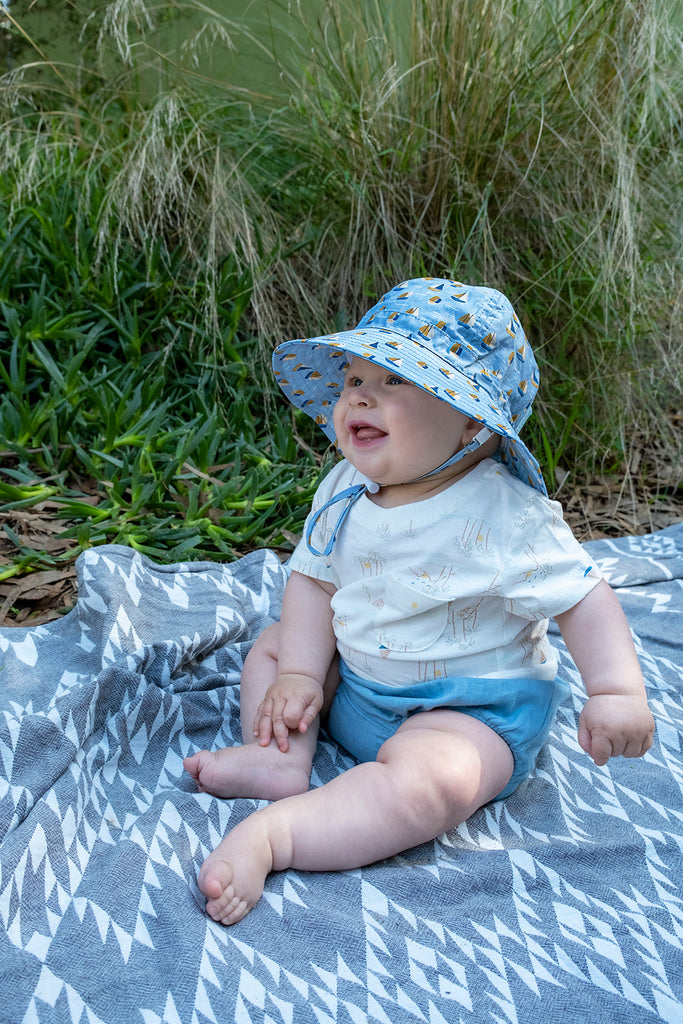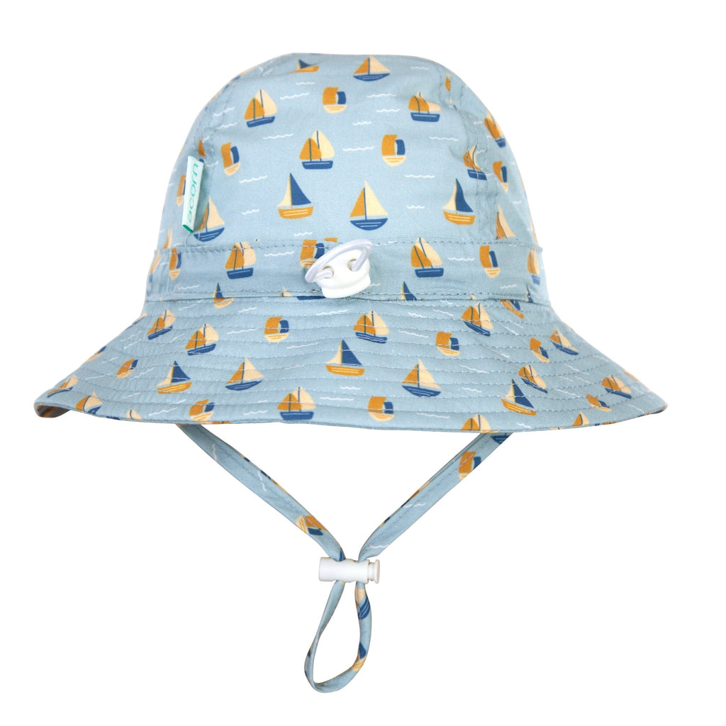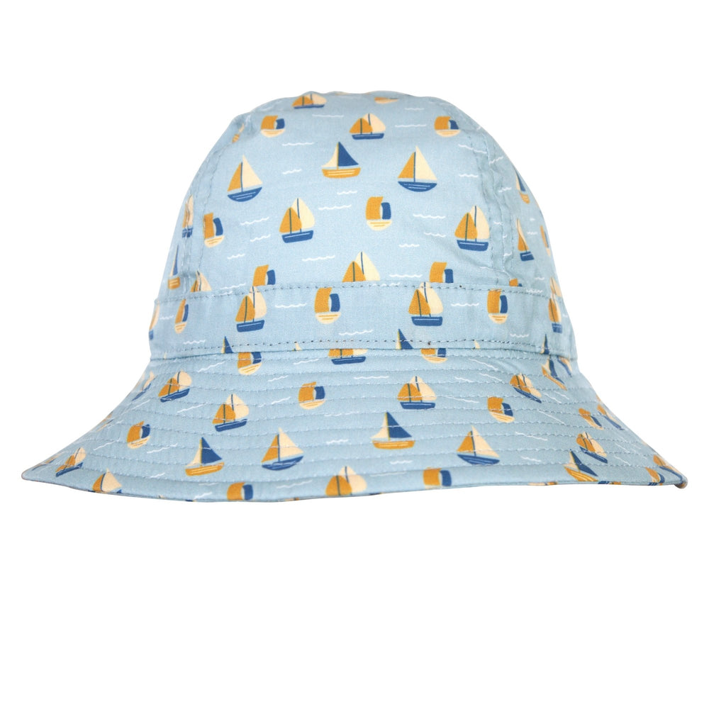 A sweet infant hat with a blue based sailing boats print designed by local artist, Jacinta Weir from Two Little Ducklings.