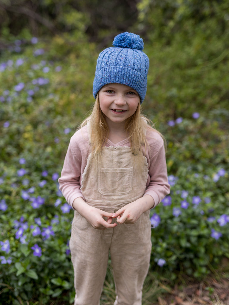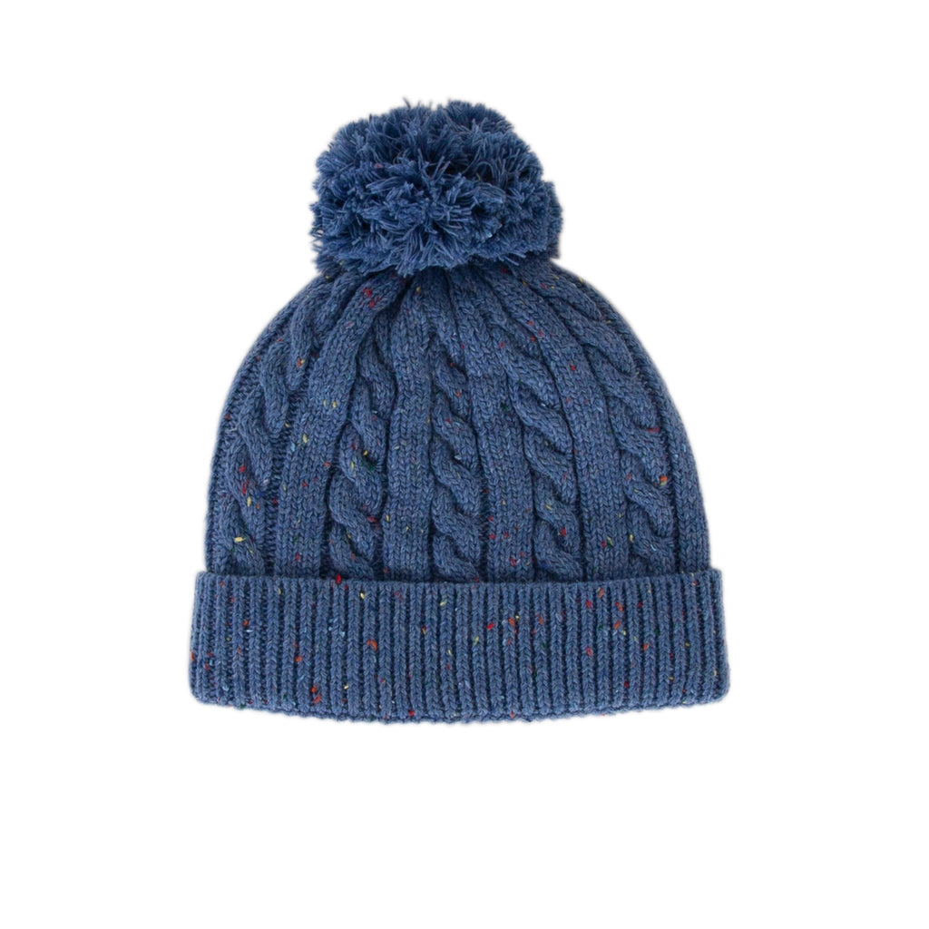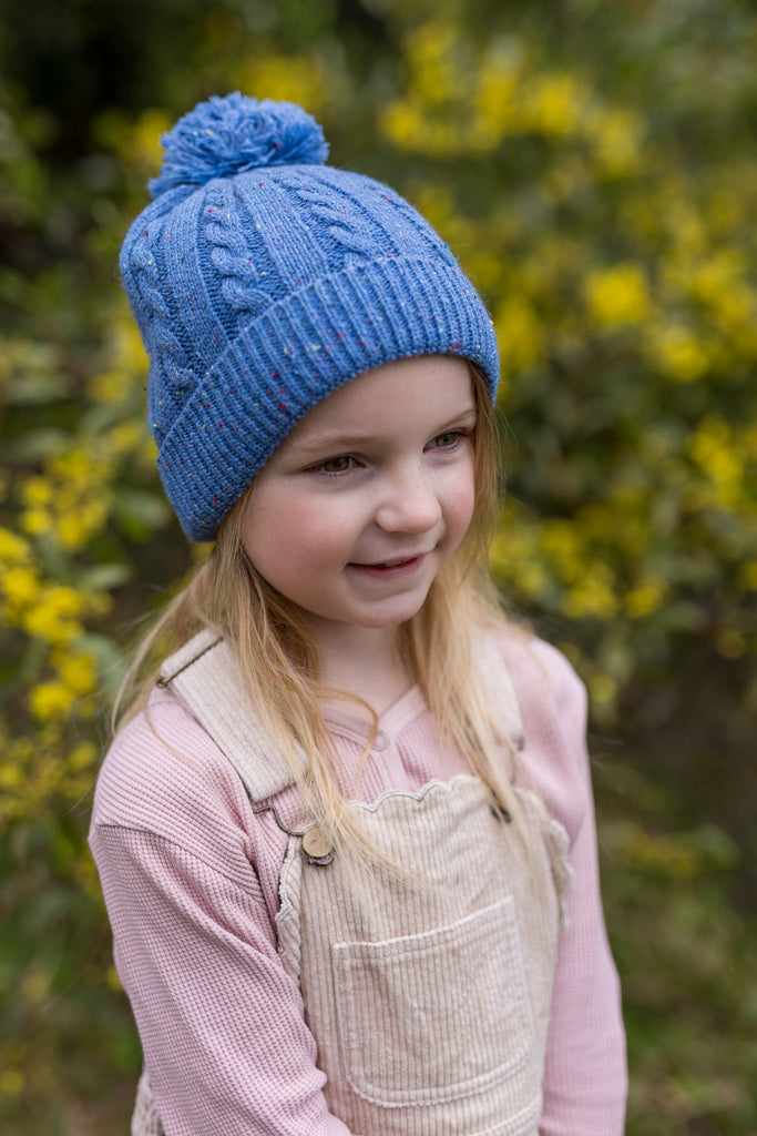This sweet beanie is made with a lovely blue yarn with a fun speckled pop of colour throughout. A classic cable knit pattern with a very stretchy and comfortable rolled ribbing at the face and a fun pom pom on top.