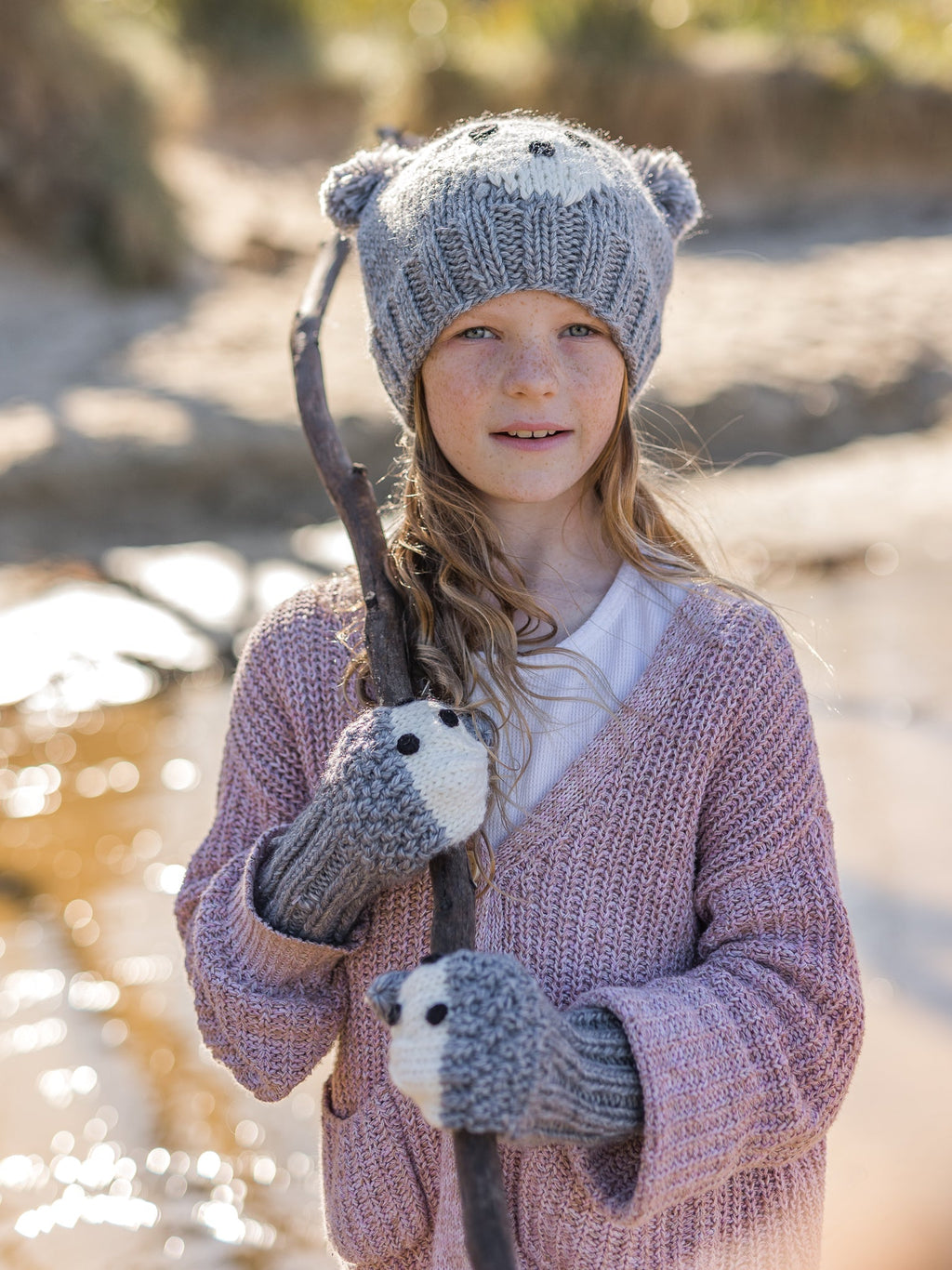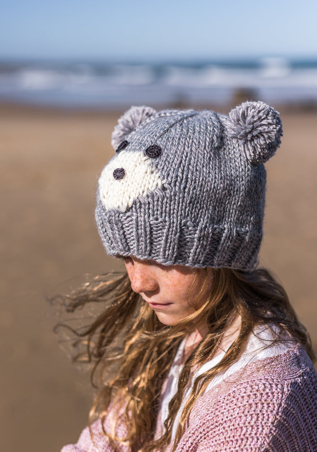 Hand-knitted with an adorable bear face design and two pom pom little ears on top.