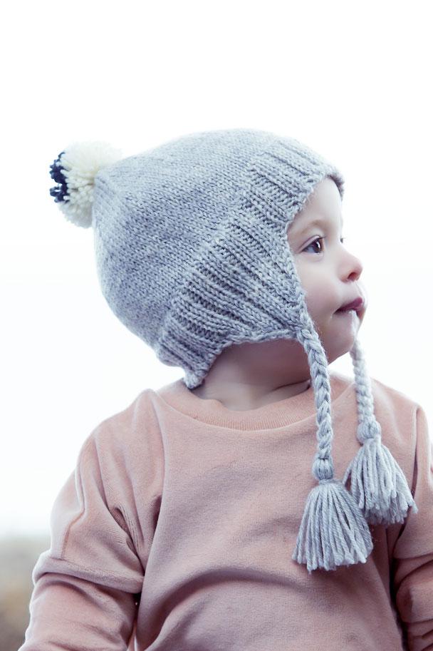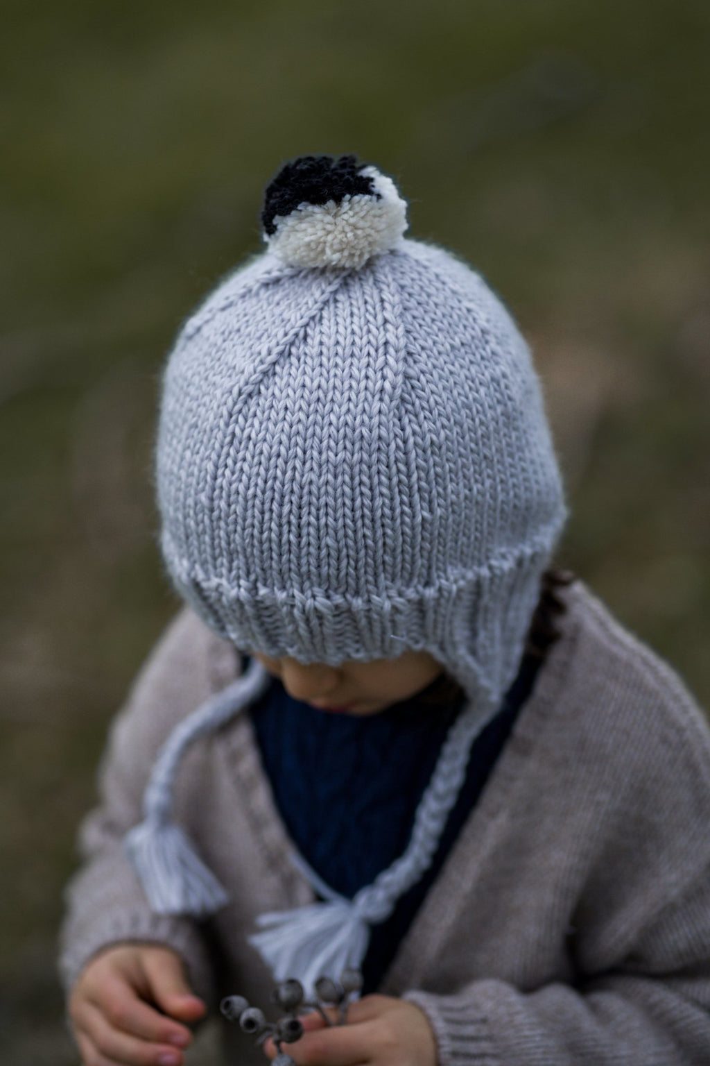 The perfect beanie for your little ones' winter wardrobe. Lovingly hand-knitted with a detailed shaping to the crown and a gentle ribbing around the face for maximum comfort. The side ear flaps with plaited ties are perfect to protect little ears as well as look absolutely adorable. Finished off with a fun two toned pom pom for a bit of fun and whimsy.