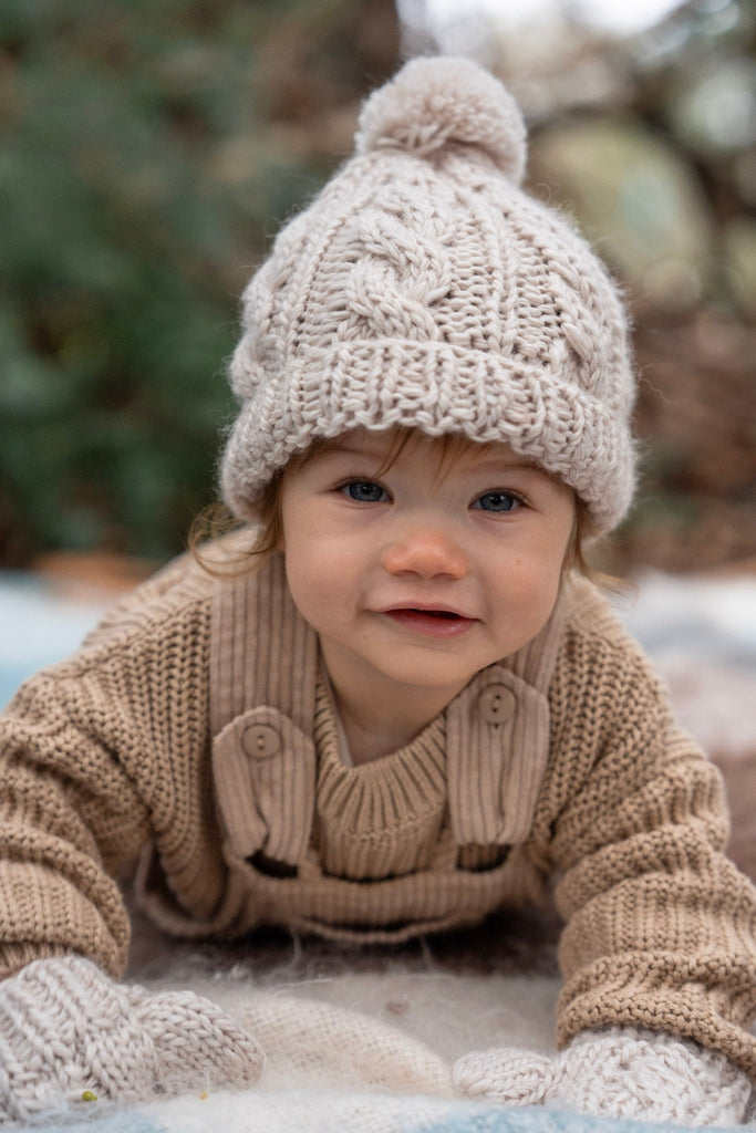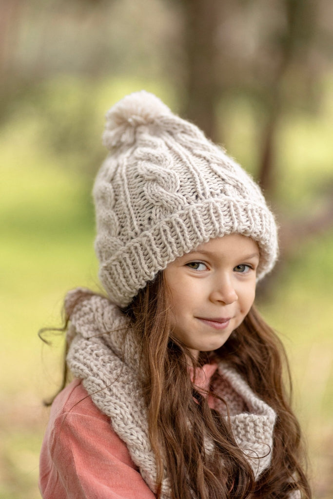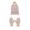 This bundle includes a super soft wool blend knit beanie, crafted with a cable knit stitch that is both stretchy and extremely comfortable. It comes with matching mittens to complete the set.