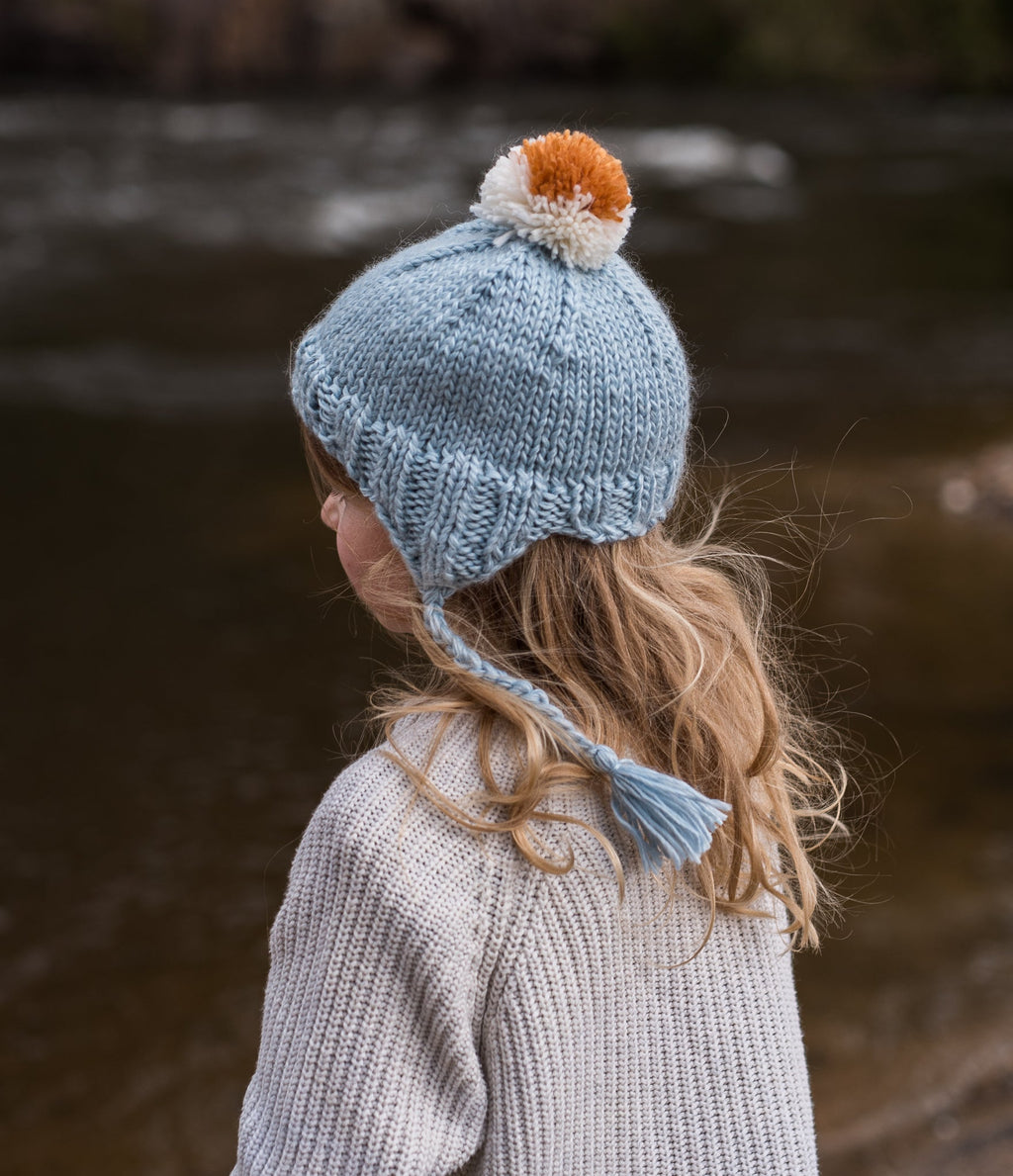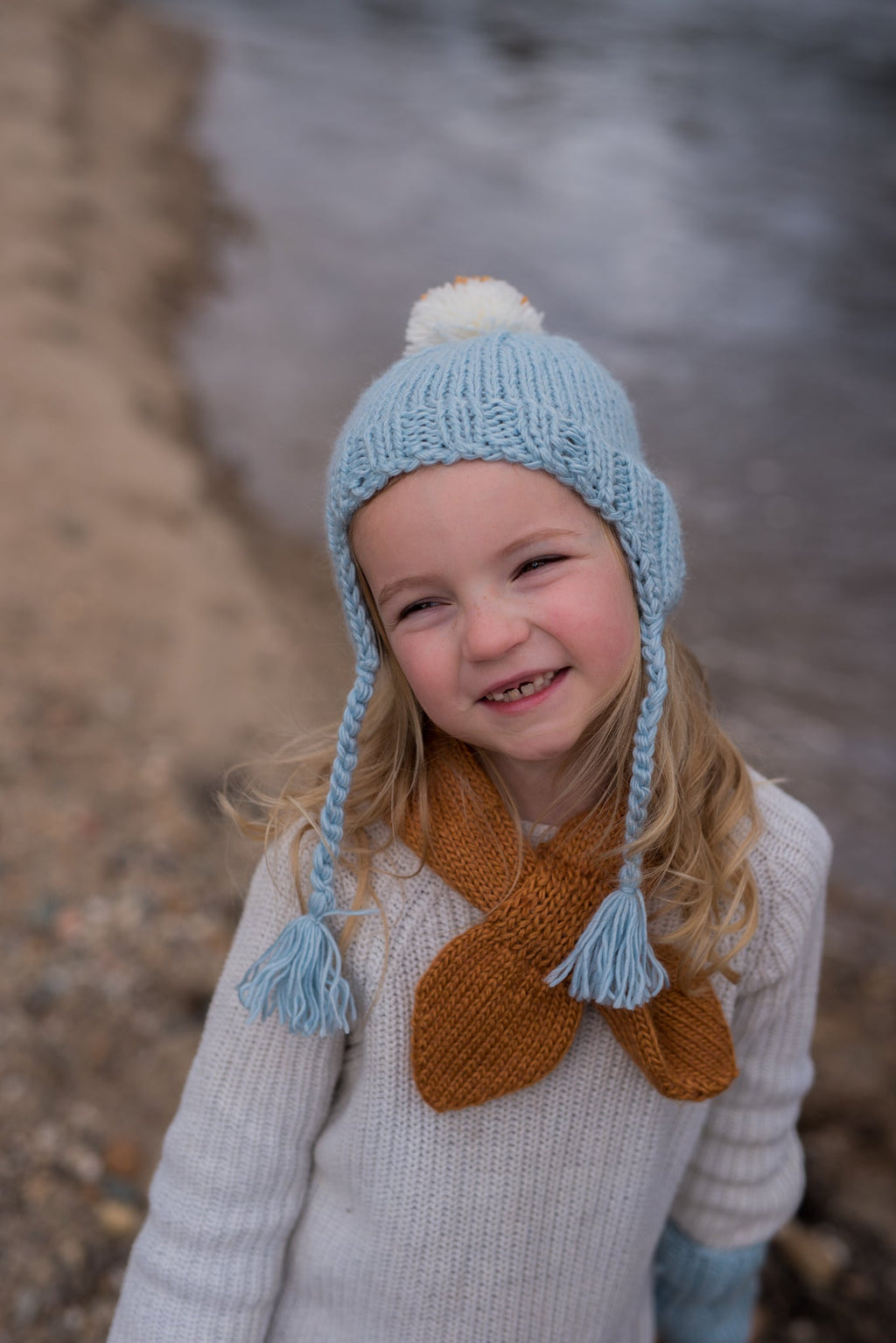 Handknitted beanie with side ear flaps and knitted tassels. Two tone pom pom on top.