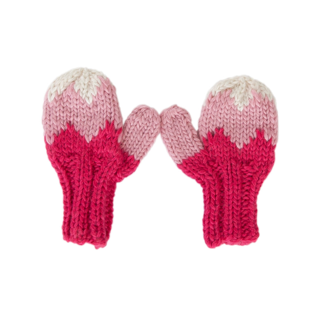 Handknitted mittens with a zig zag pattern and a 2x2 ribbed cuff.