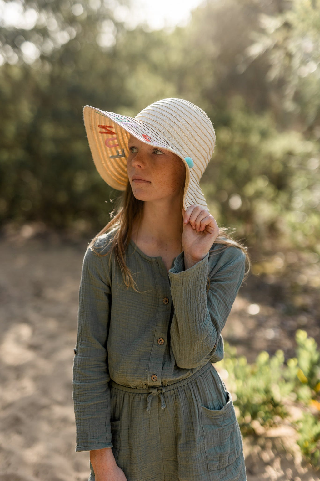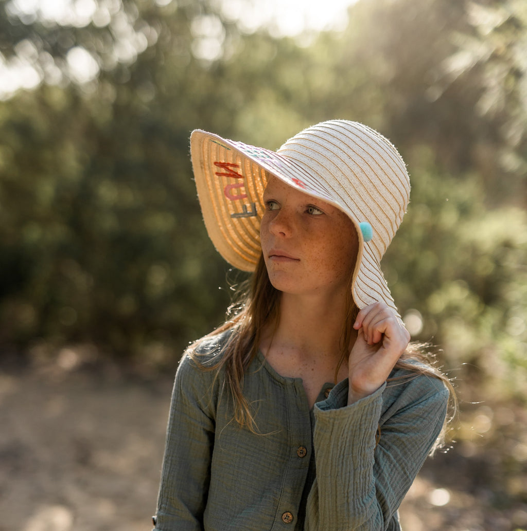 This adorable hat features colorful text and playful pom poms around the brim for a fun pop of style. With a comfy inner sweatband to keep it snug in place and a wide brim for extra sun protection, it's made for sunny days.