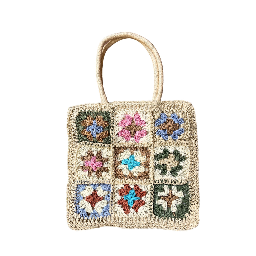 Crochet bag with vintage inspired embrodered granny squares on the front.