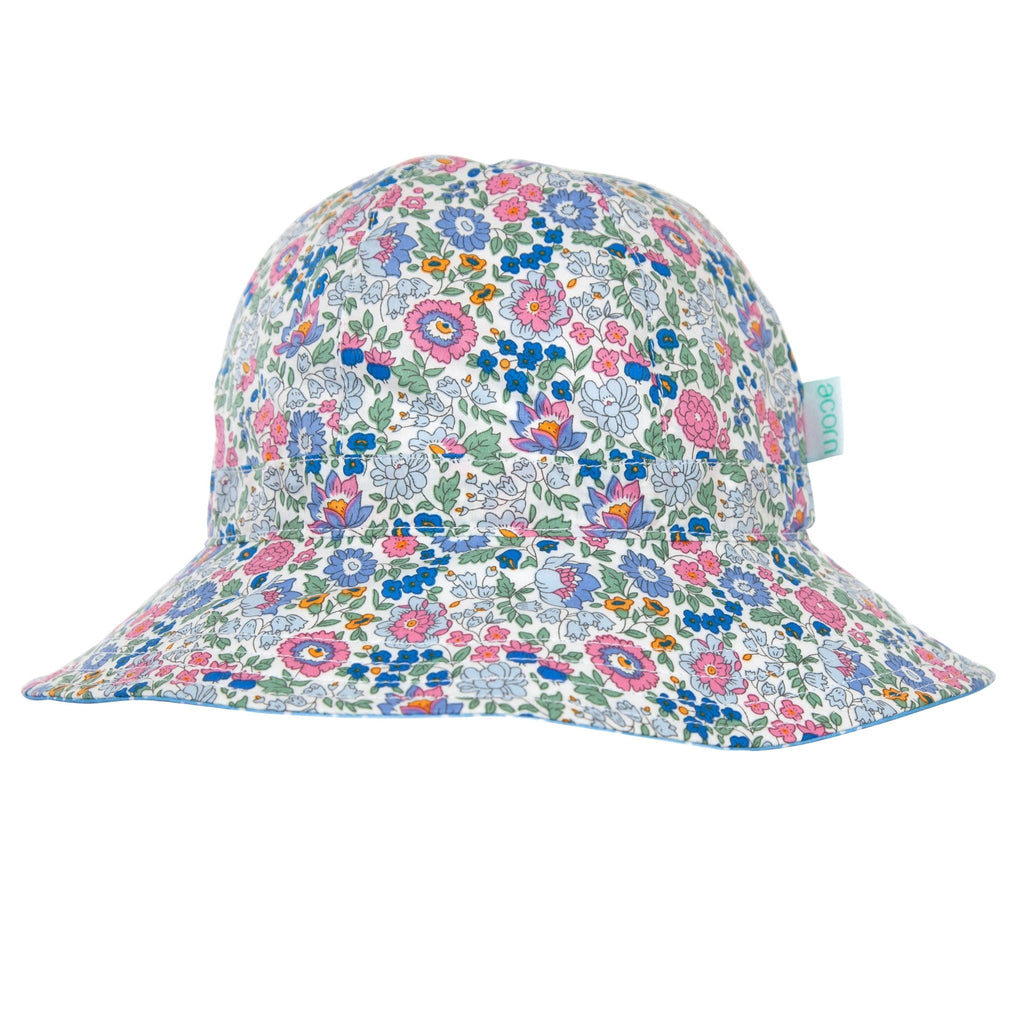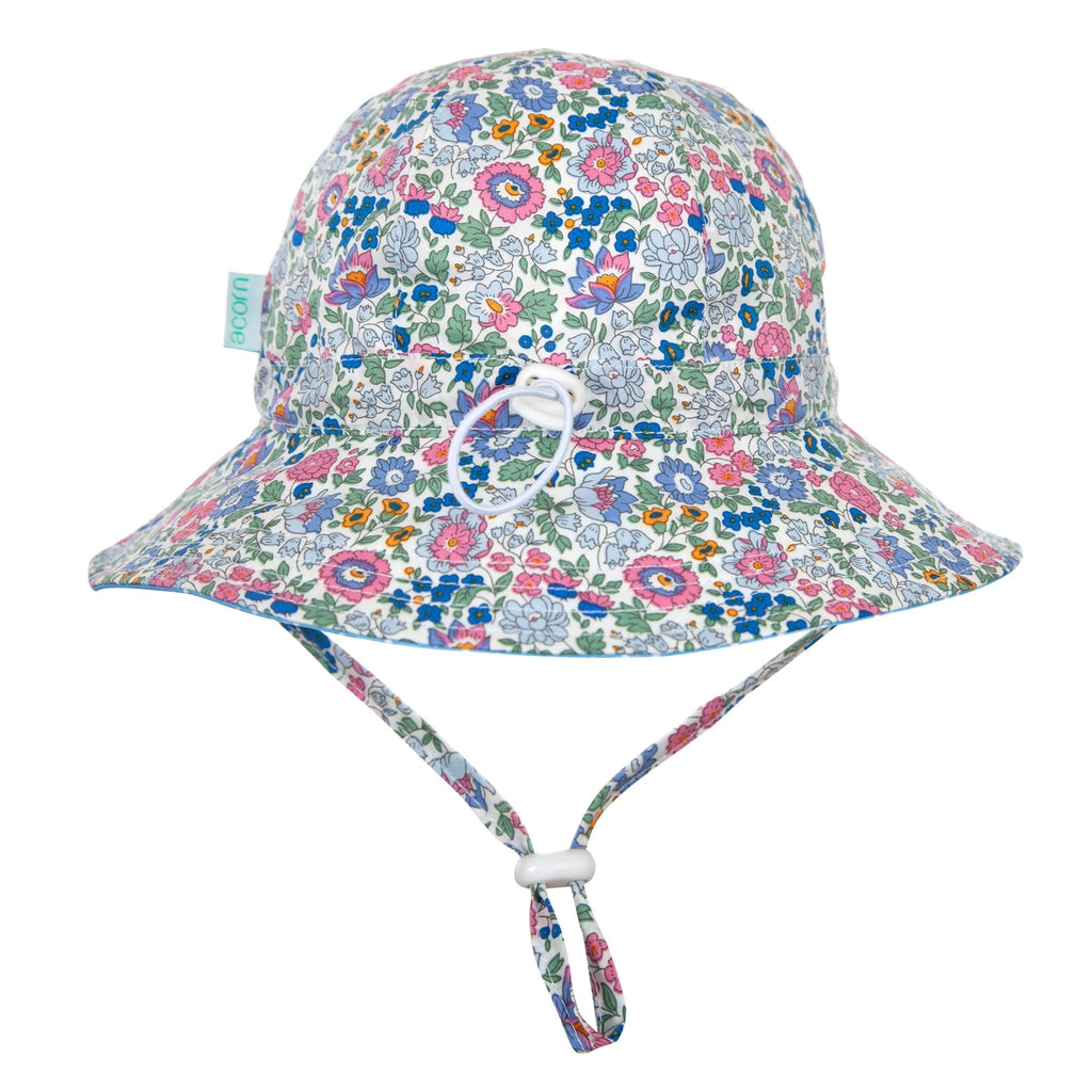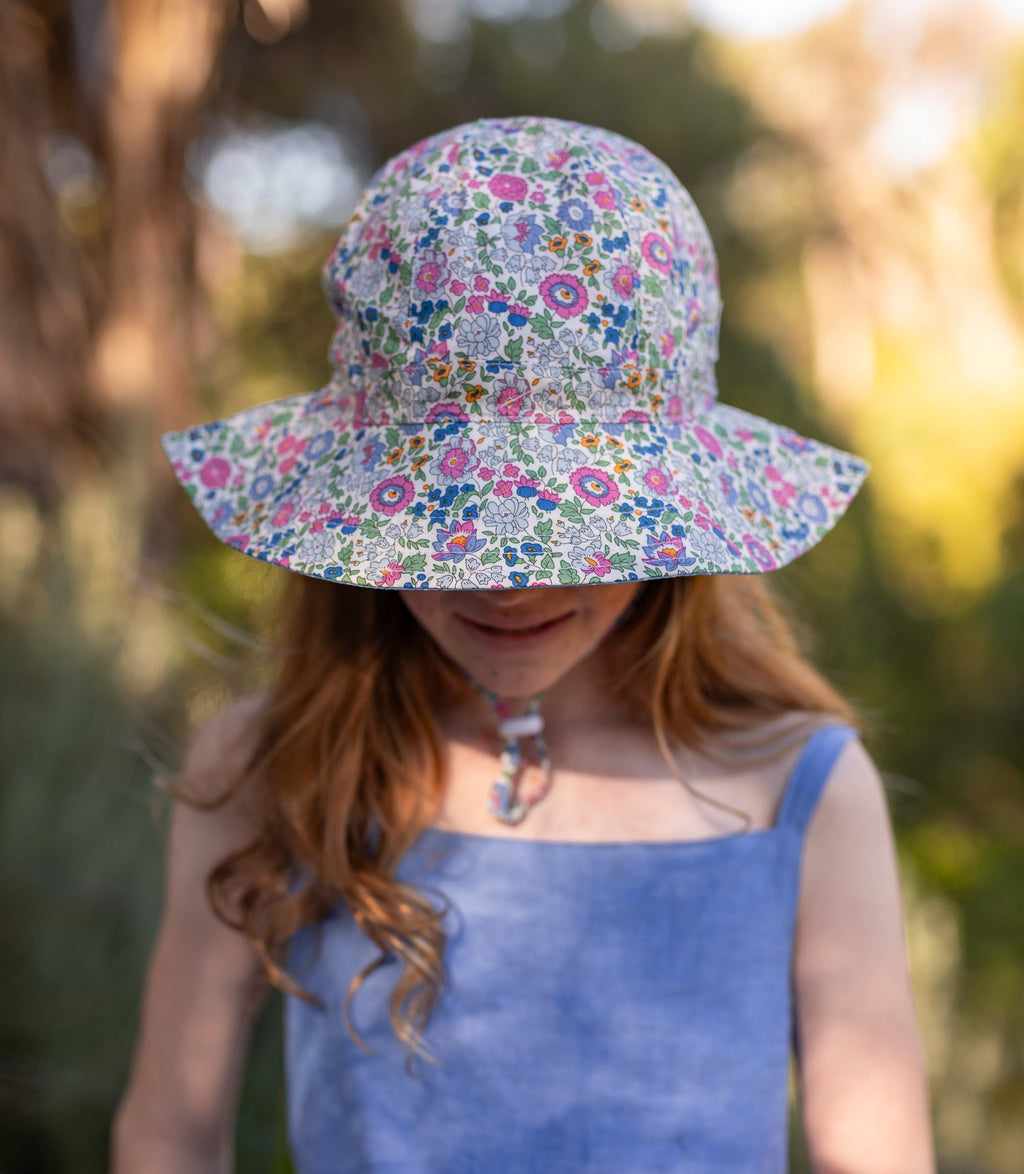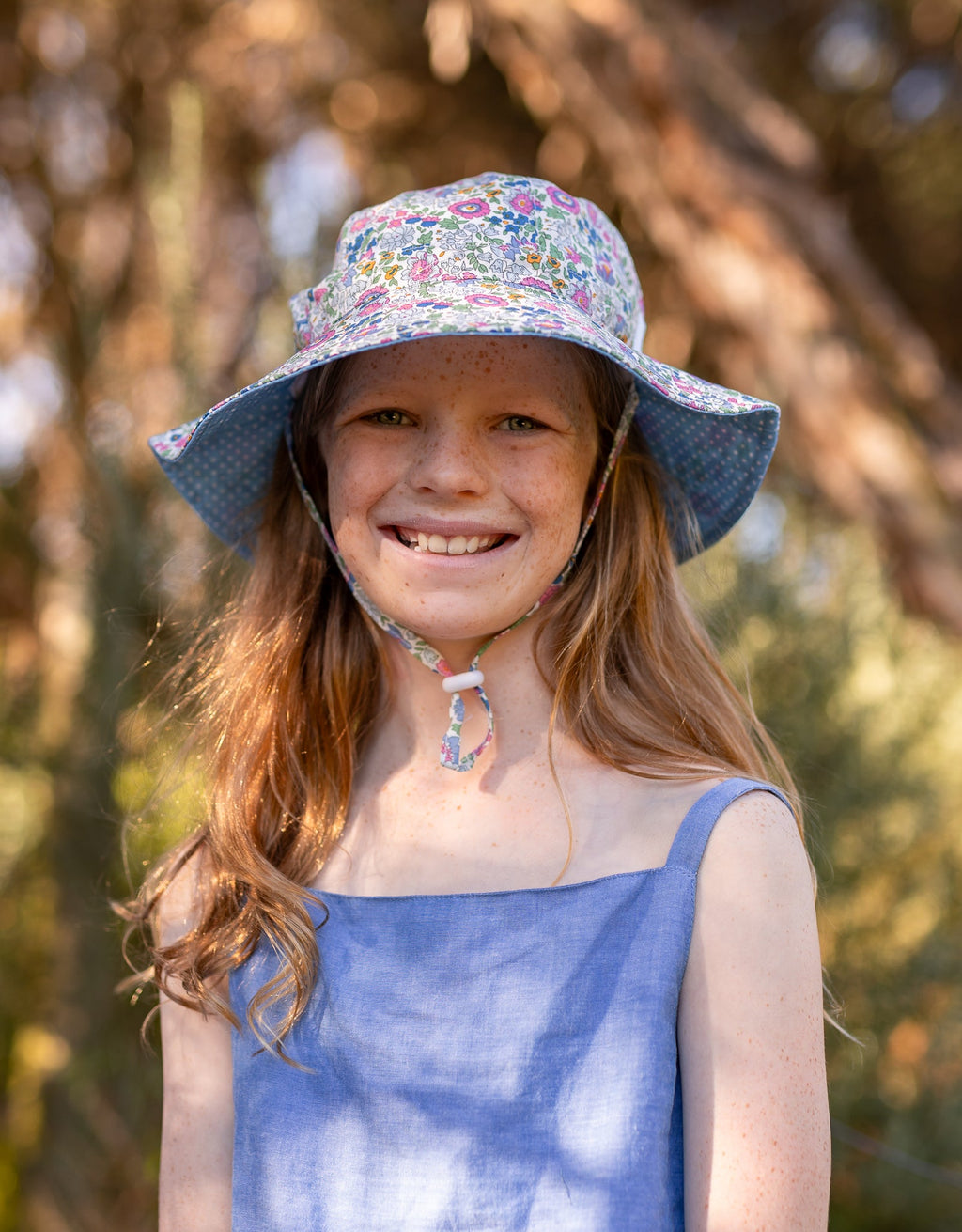 The prettiest sunhat with a pink and purple floral print on the outside and a blue and white polka dot print on the inner brim.