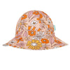 This simply stunning wide brim sunhat features a golden and peach retro inspired floral print on the outside and a gold and white polka dot print in the inner brim.