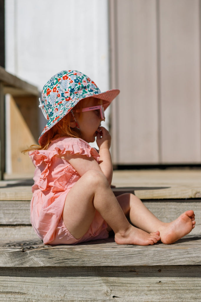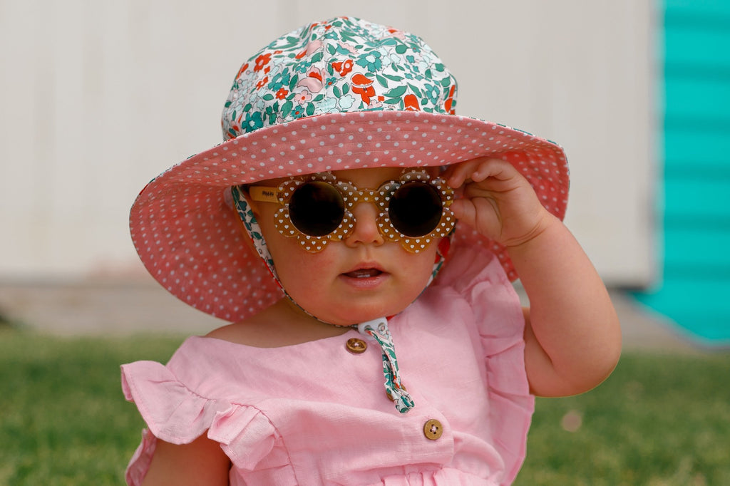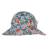 Floppy hat with a stunning floral print on the outside and a fun pink and white polka dot print in the inner brim.
