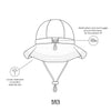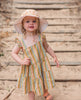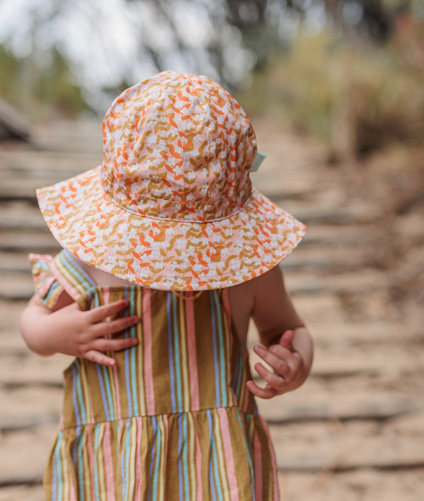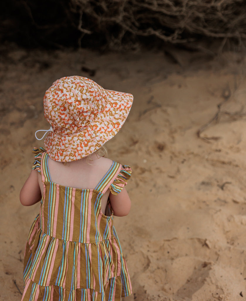 Such a cute sunhat with a Wildflowers print on a neutral toned base and a gold and white polka dot print in the inner brim. A wonderful neutral toned sunhat that will go with all their summer outfits.