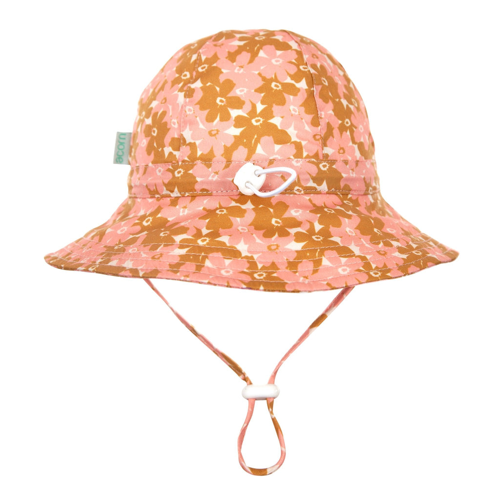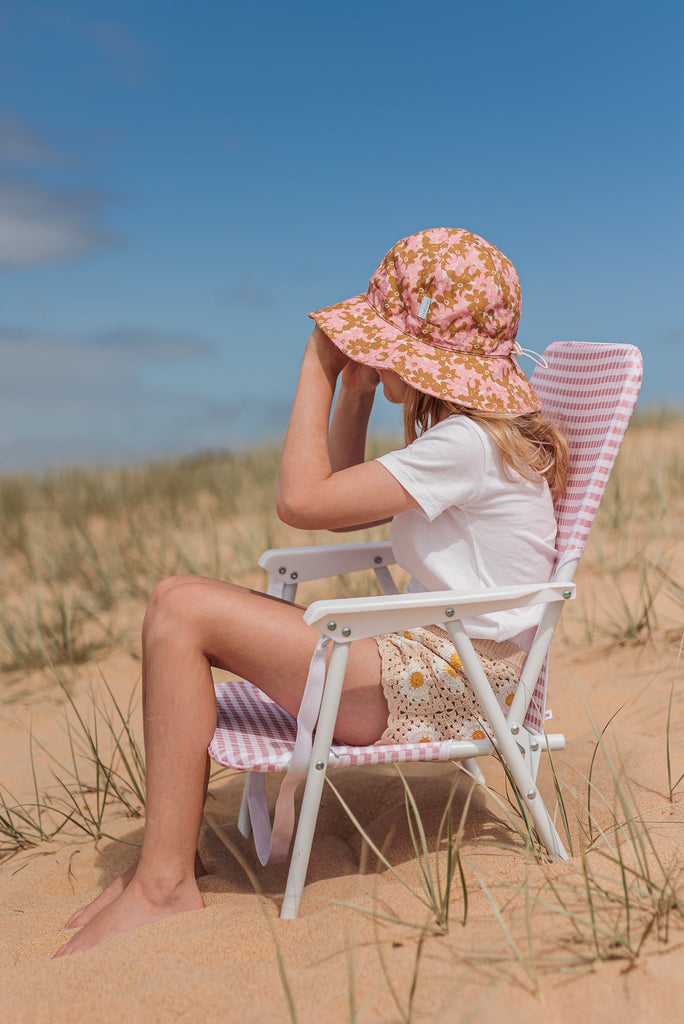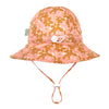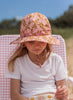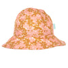 A lovely wide brim sunhat with a stunning gold and dusty pink floral print on the outside and inner brim.