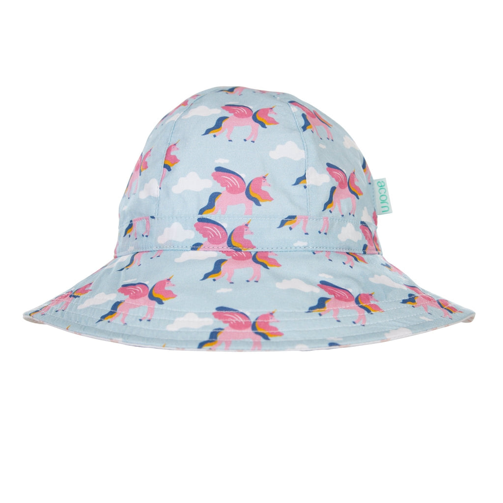 Do you have a Pegasus and Unicorn obsessed little one? This beautiful hat will be a hit! Featuring a Pegasus print in blue and pink on the outside and a pink and white floral dots print in the inner brim.