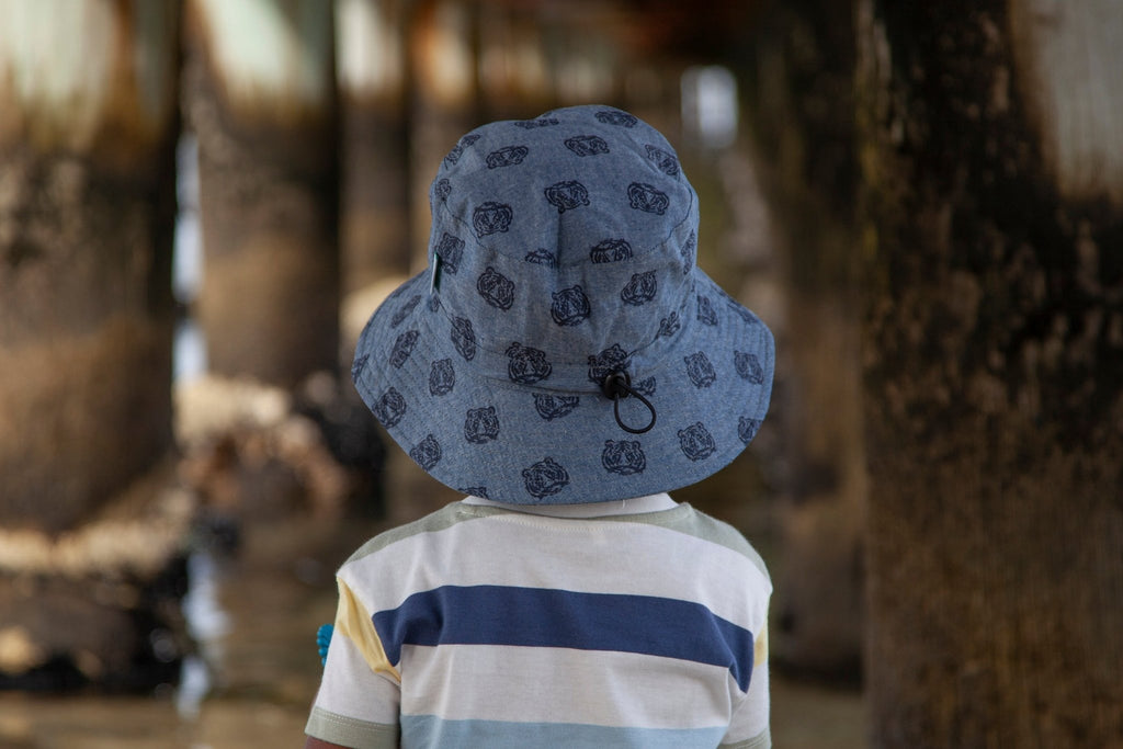 Roar into style with this chic bucket hat featuring a tiger face stamp print on both the outer and inner brim, set against a chambray base. The original artwork was designed in Melbourne by artist Jacinta Weir.