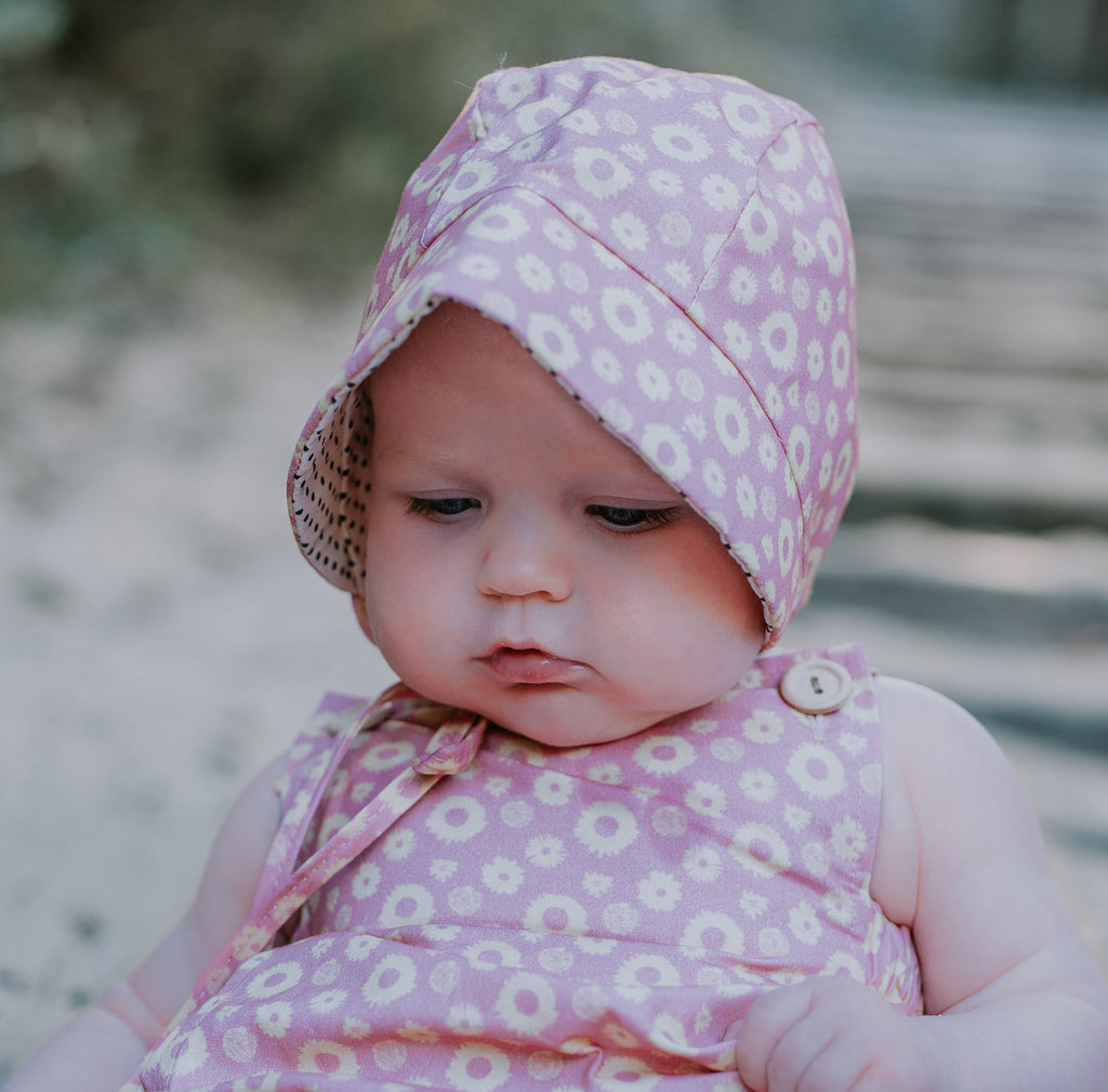 The bonnet is available in sizes 0-6M and 6-12M (will fit well beyond 12M) and is fully reversible. It features the Indigo print on one side and a super sweet cream with black polka dots on the other. Two bonnets in one!