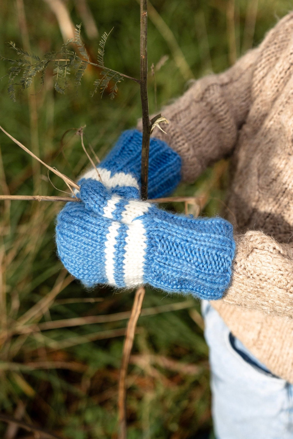 Super soft wool blend hand-knitted mittens that have a retro stripe detail on the hand area and a 2x2 ribbing at the wrist that is very stretchy and comfortable to wear and will also help the mittens stay on well.
