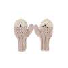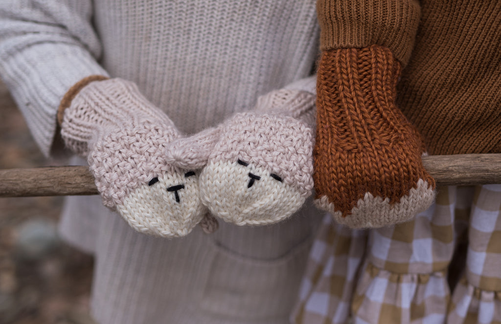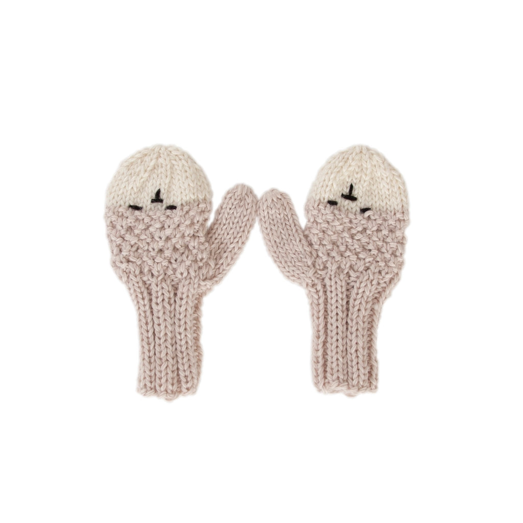 Hand knitted mittens with sweet face detail on tip area, a moss stich on the hand area and 2x2 ribbed cuff.