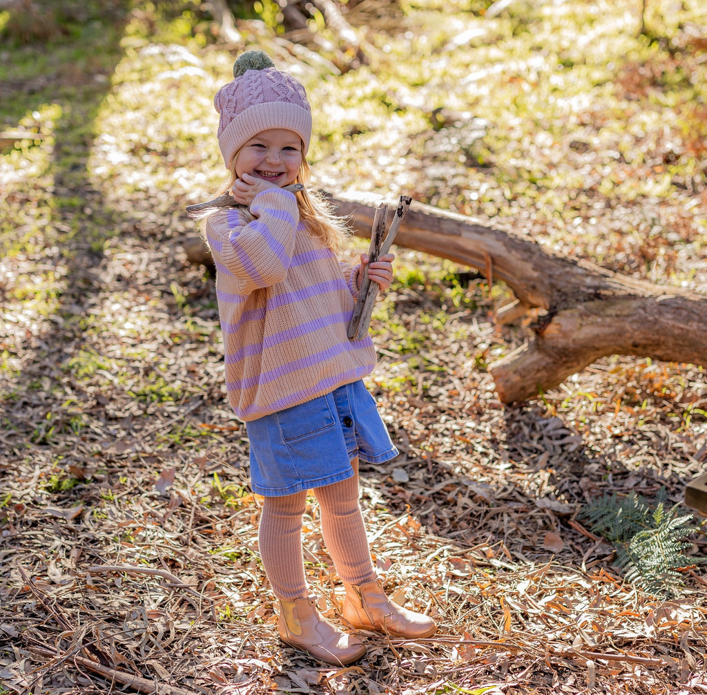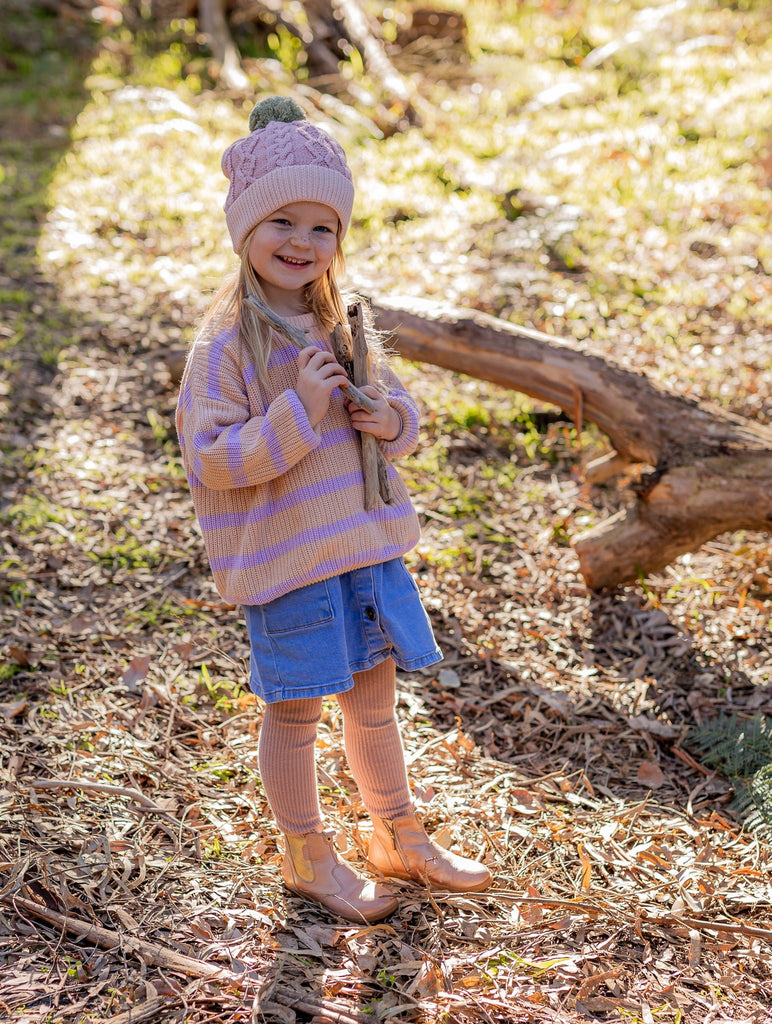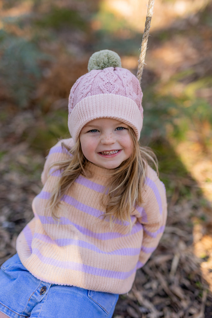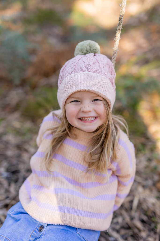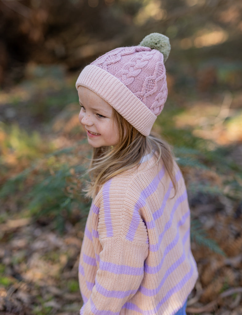 Get ready to meet your little ones new favourite accessory - the August Merino Beanie in dusty pink! This beanie features a classic cable knit design with a playful pop of pink and sage green. It's the perfect blend of style and practicality.