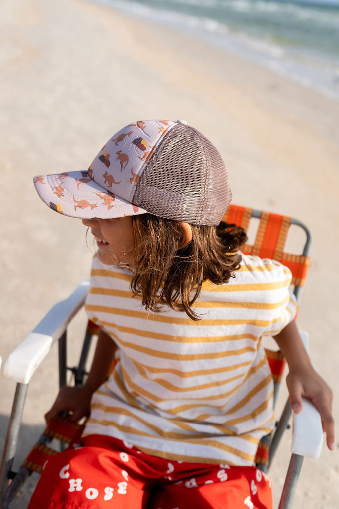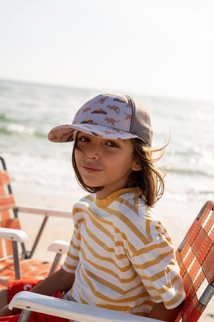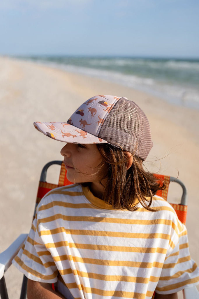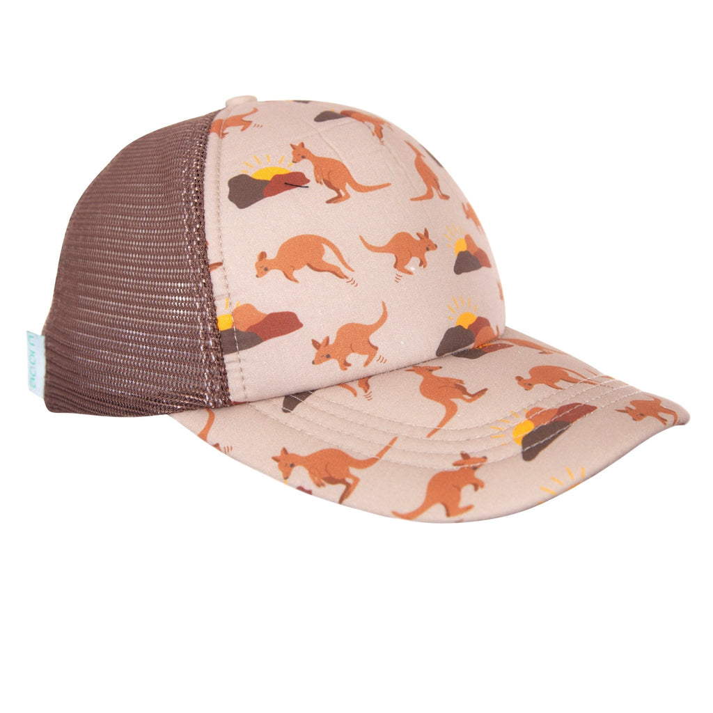 Get set for summer time fun with this a super cool trucker cap with an Australian print featuring a sunset and kangaroos. The original artwork was designed in Melbourne by artist, Jacinta Weir.