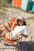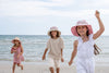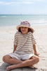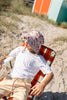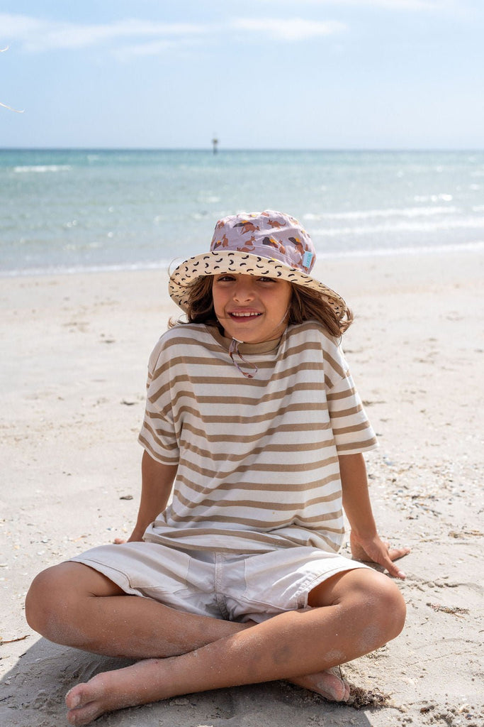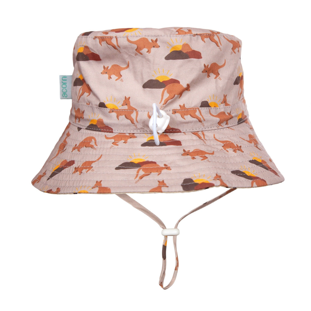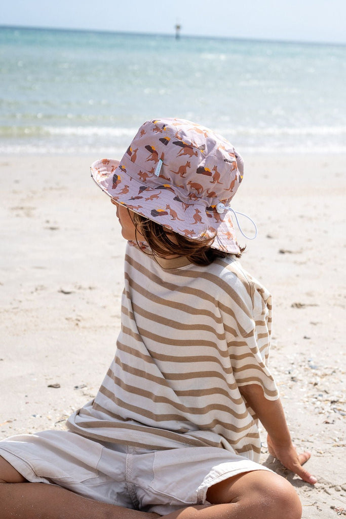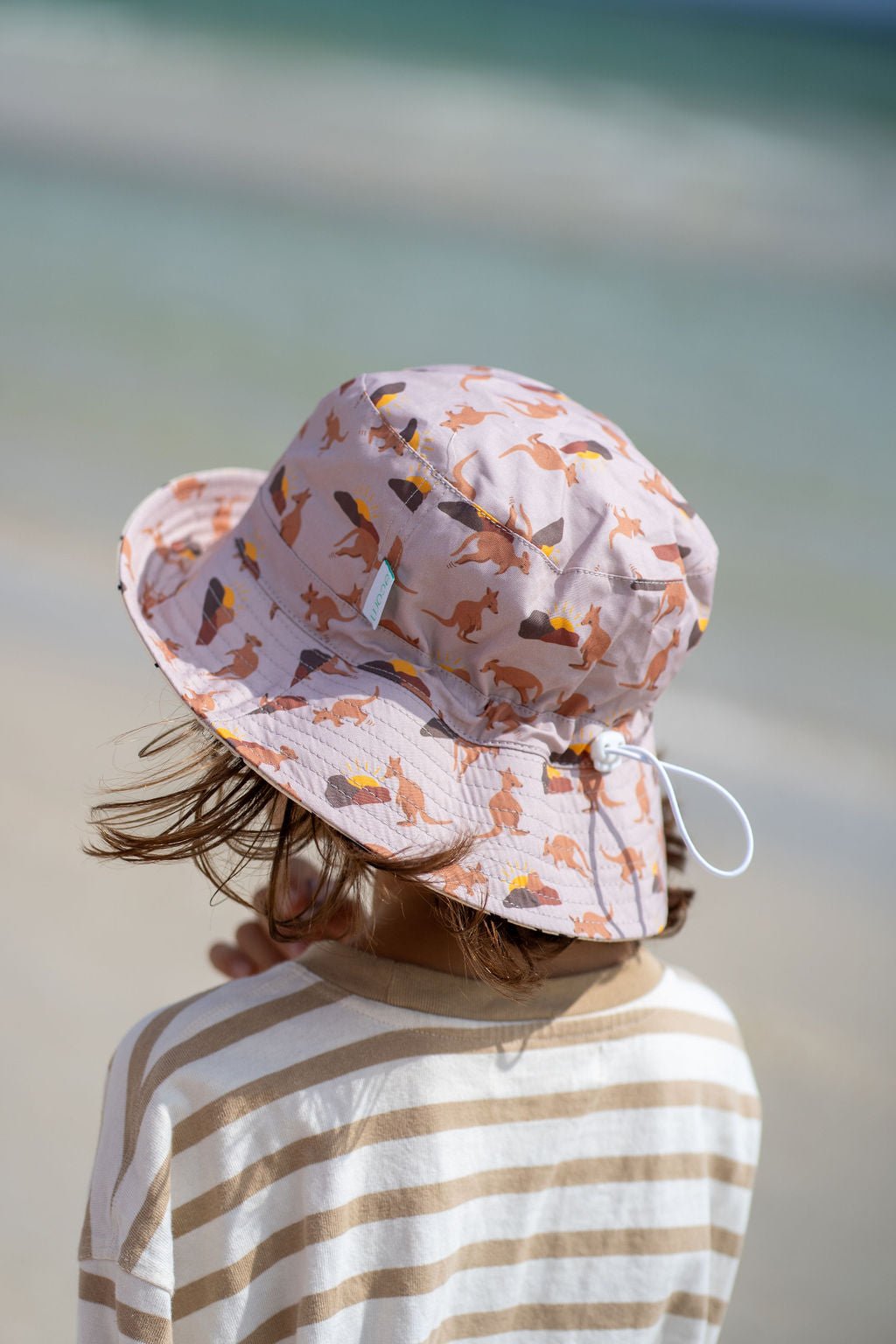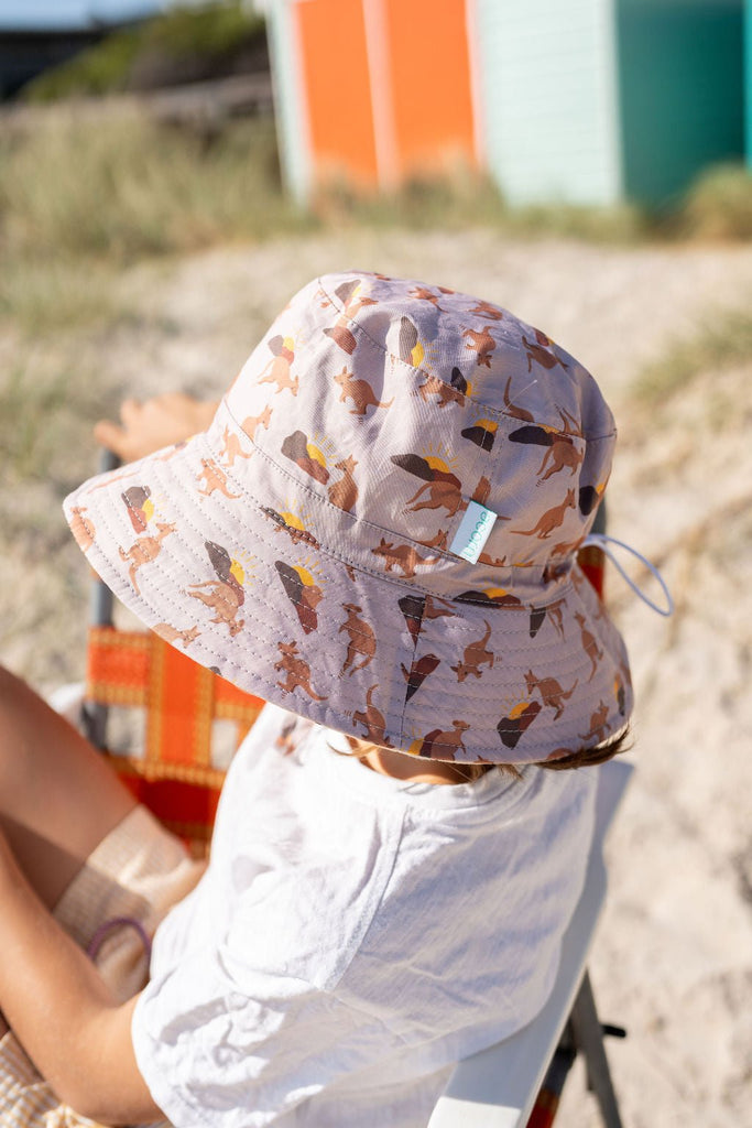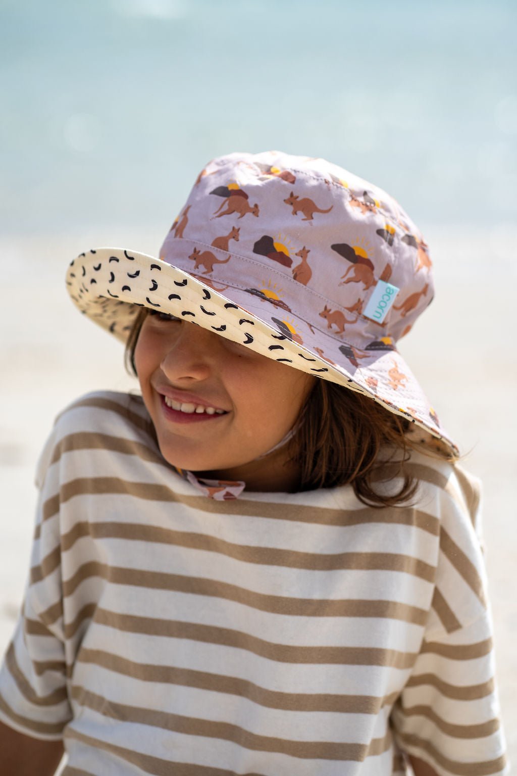 Get set for summer time fun with this a super cool Australian print featuring a sunset and kangaroos on the outside and a cream and black dashes print on the inner brim. The original artwork was designed in Melbourne by artist Jacinta Weir.