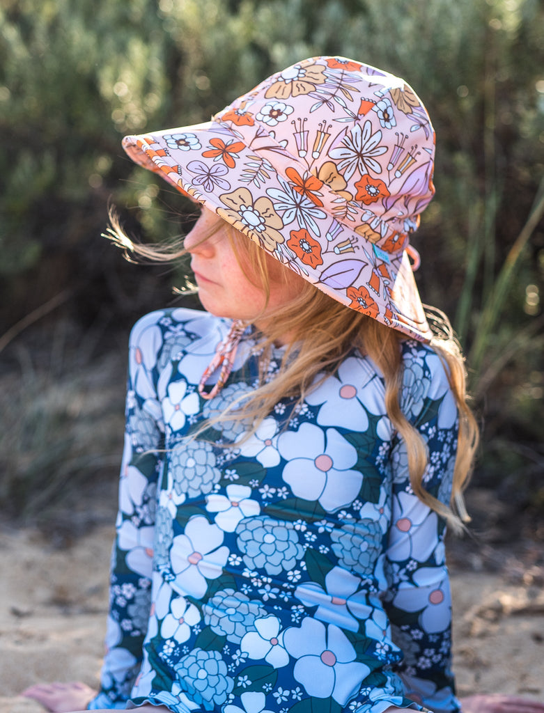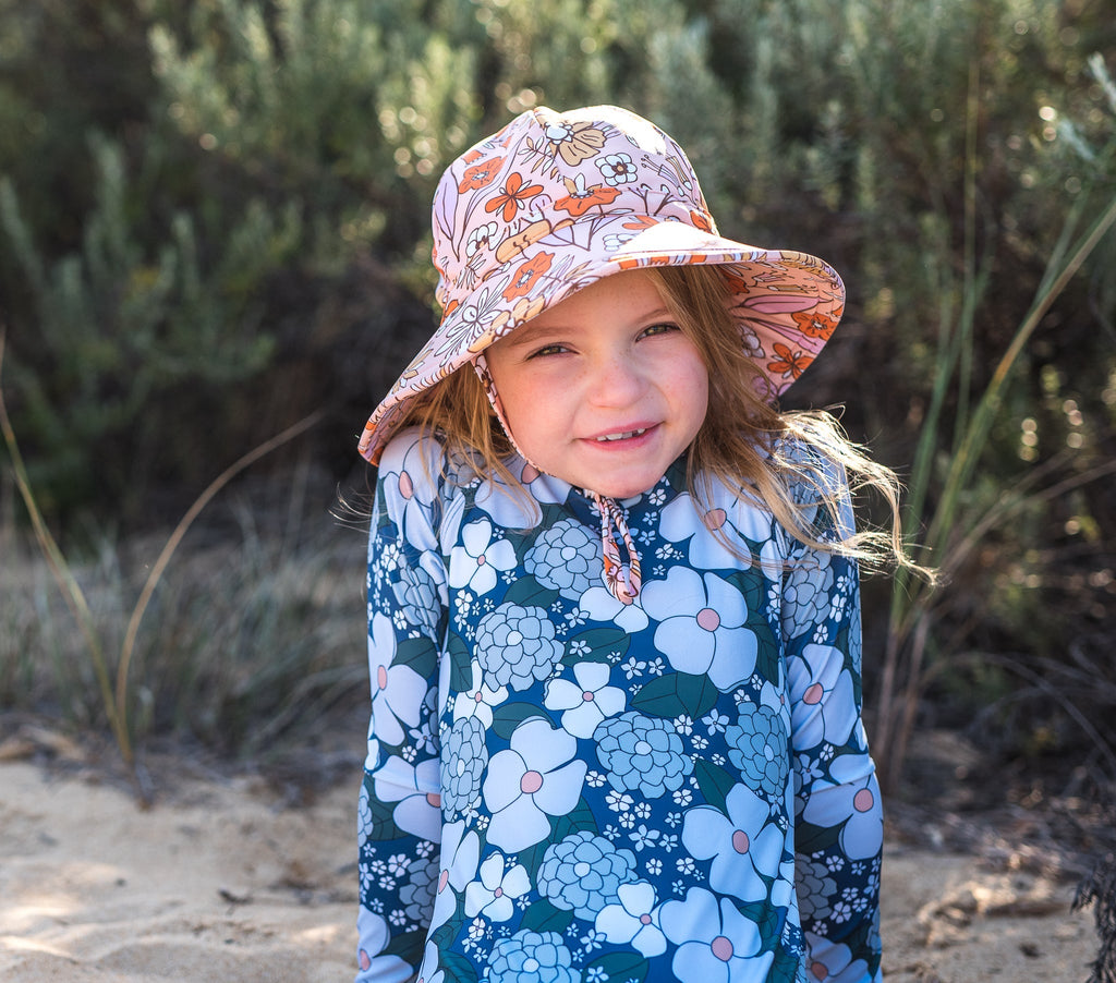 This is my 3rd year with acorn hats we absolutely love then the brim is lovely and wide it doesn't loose shape after getting wet so doesn’t flop over their eyes. True to size love the tie around the head so doesn’t blow off in the wind and beautiful prints very happy