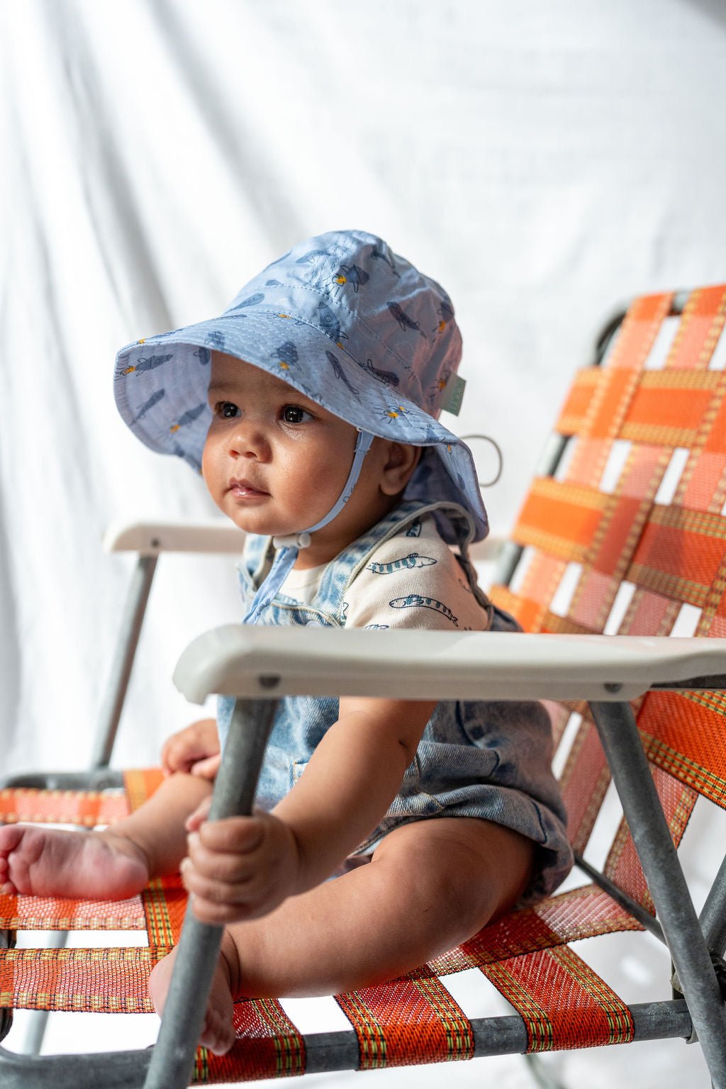 Baby sun hat with a fun rocket ship print designed in Melbourne by Jacinta Weir from Two Little Ducklings.