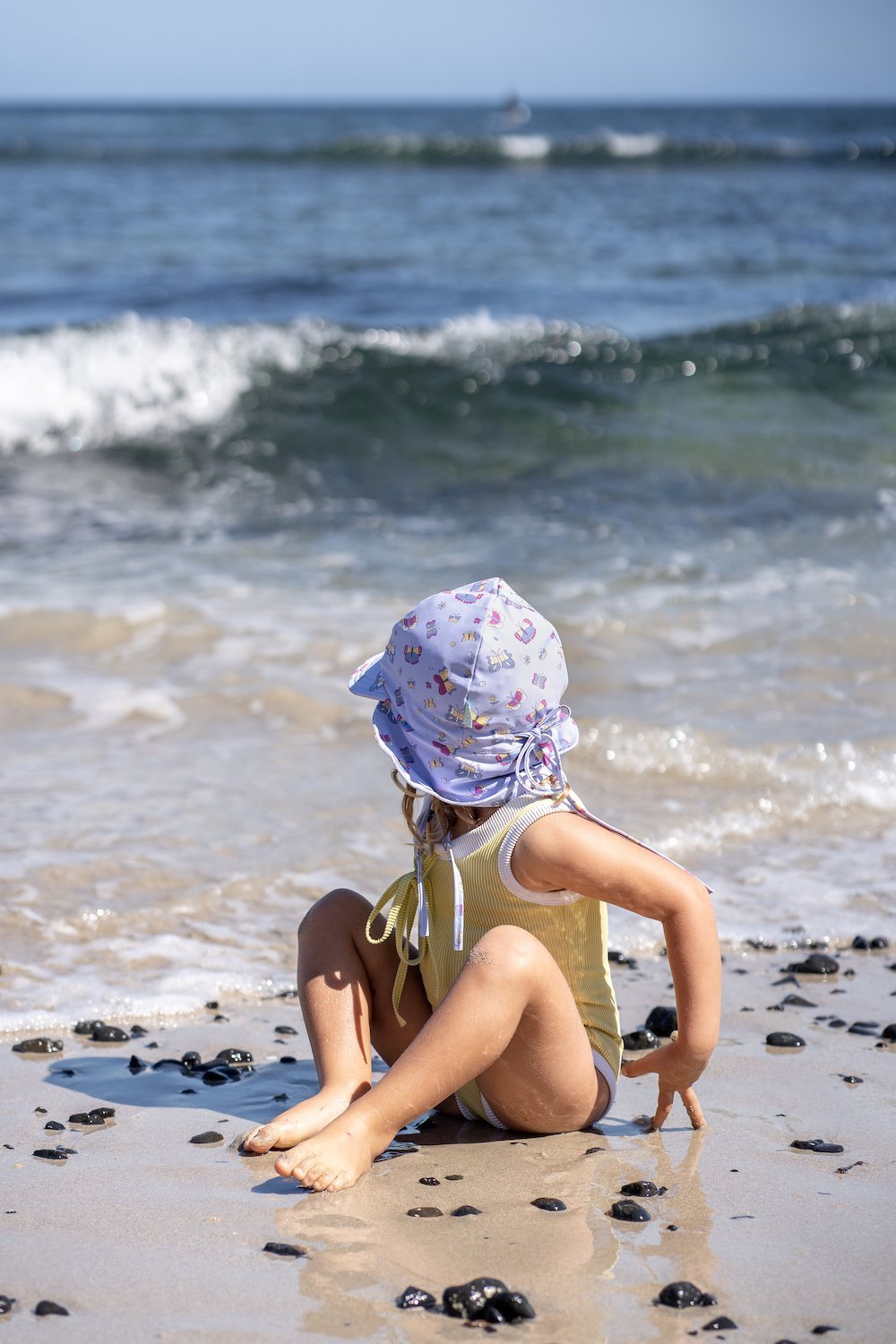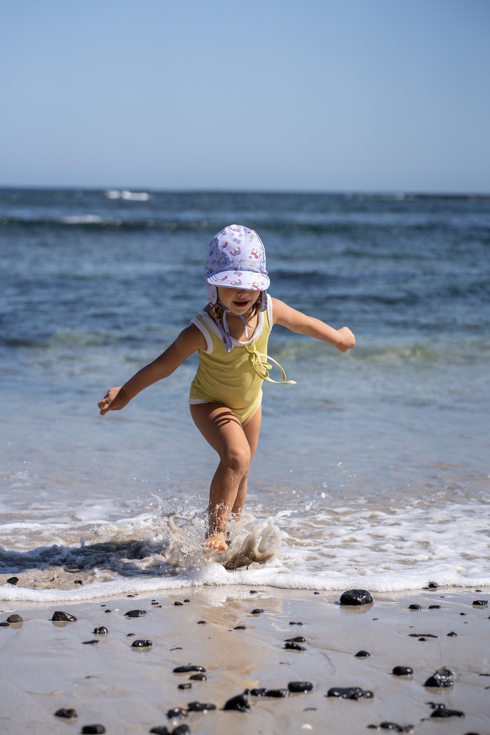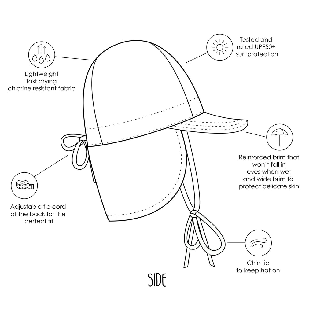 It has a lovely wide brim (Measures for each size S: 6cm, M: 6cm, L: 6.5cm, XL: 6.5cm) that is reinforced with a foam inner to ensure the brim will stay out of their eyes even when playing in the water as well as a deep back flap for excellent sun protection for their neck and ears.