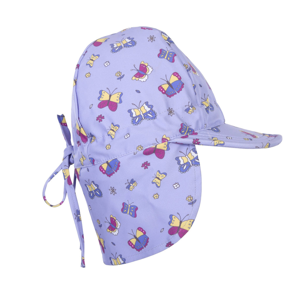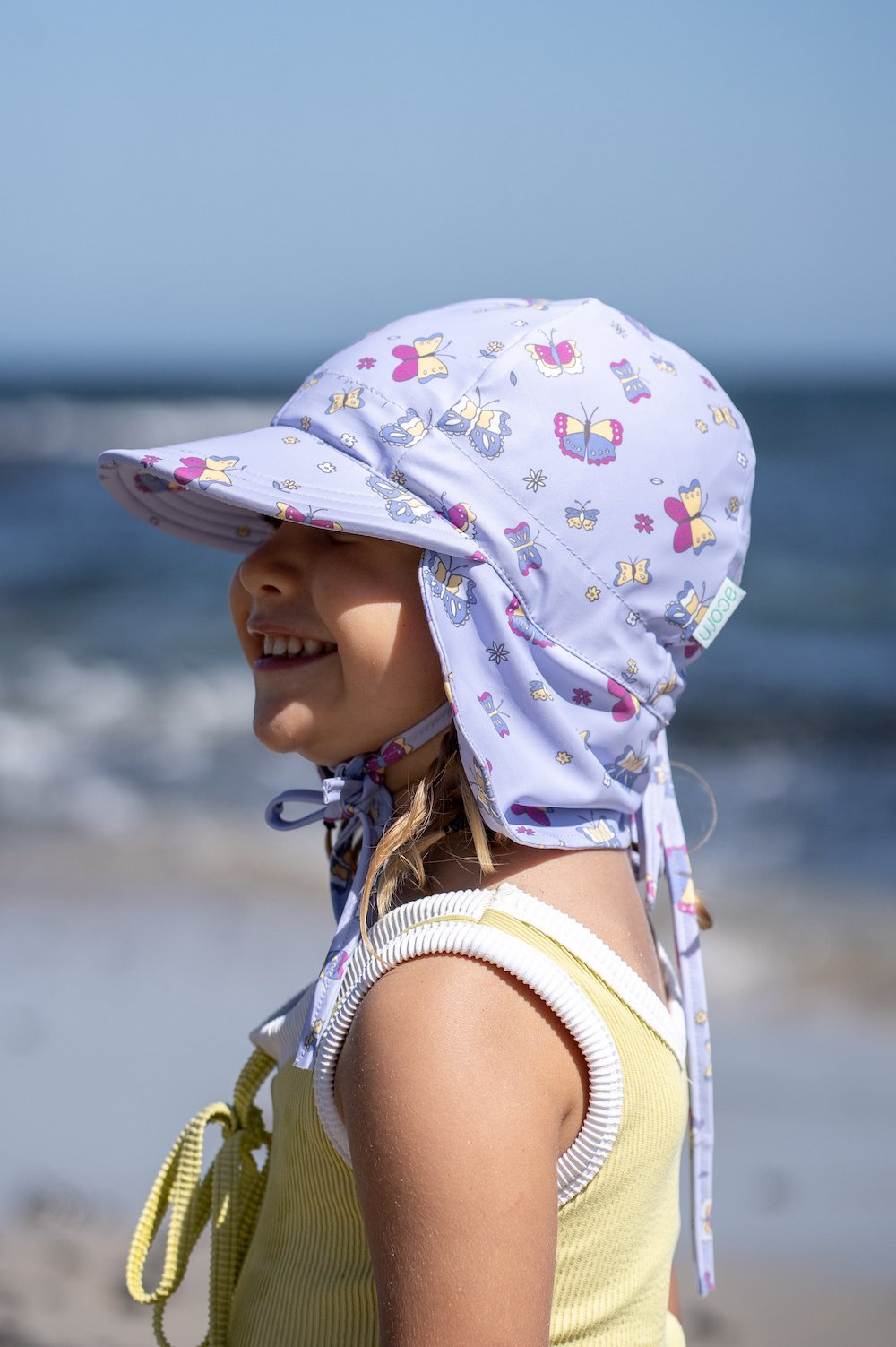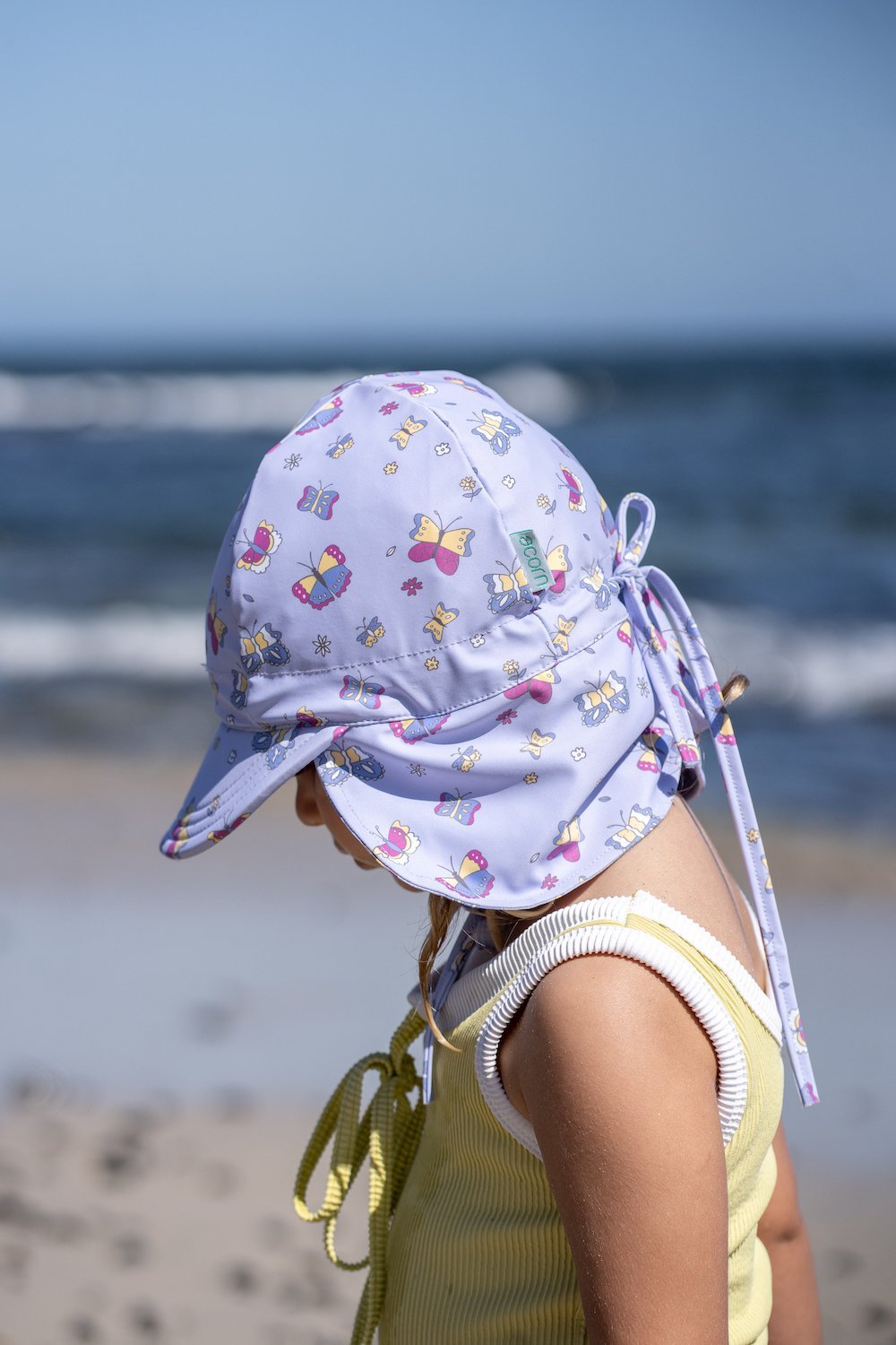 This beautiful swim flap cap will be a favourite for your little one this season.  Featuring a stunning lilac based butterfly print.