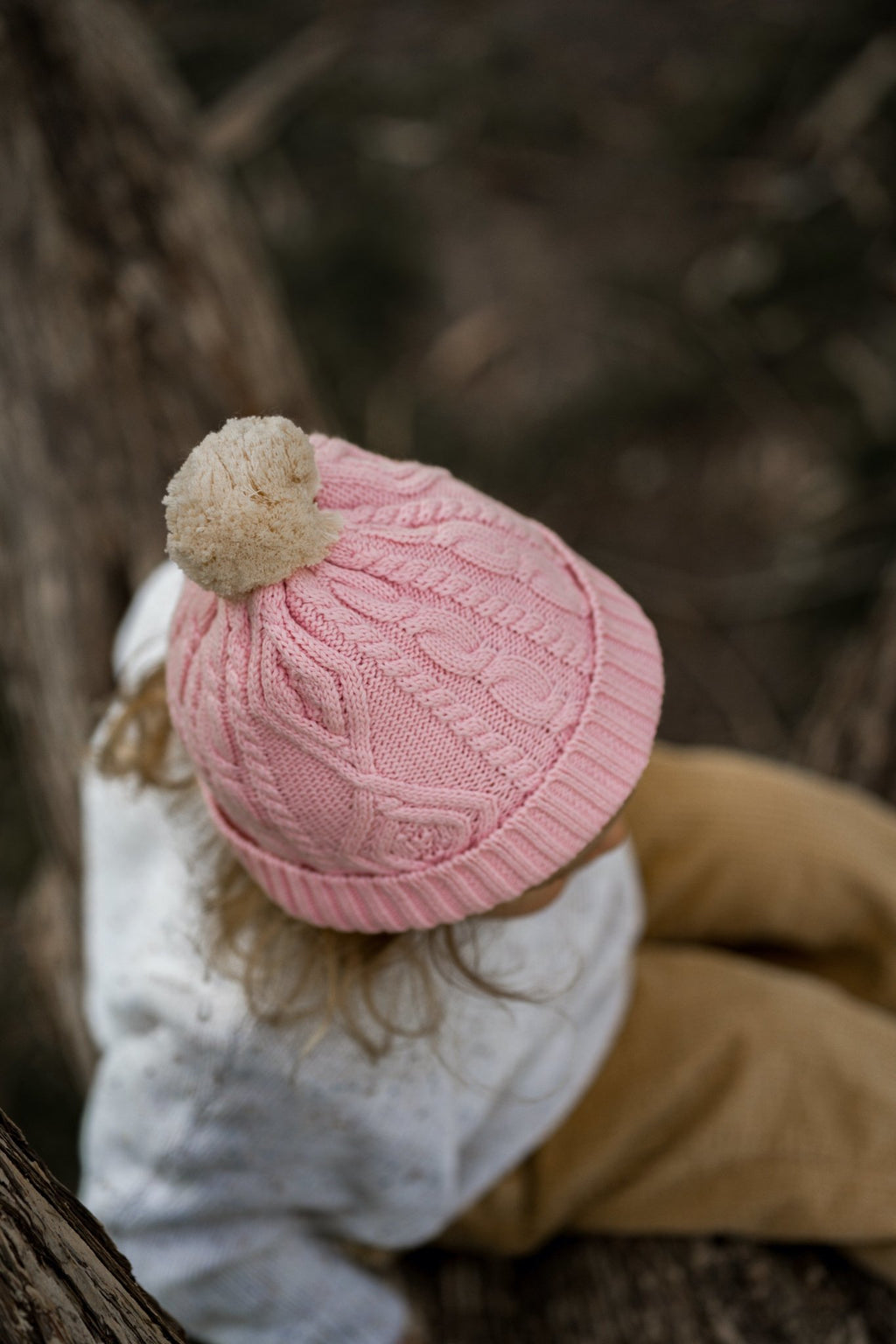 A beautiful beanie topped off with a fun contrast Pom Pom.