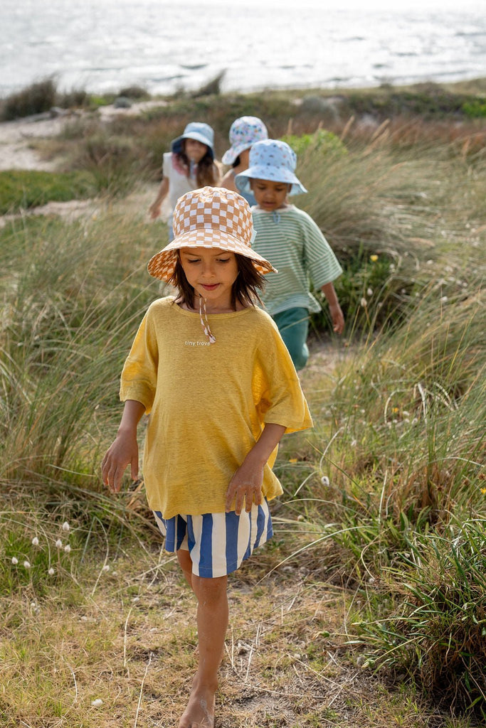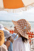 Let the summer fun begin, with this super cool caramel and cream checks print on the outside and inner brim. The original artwork was designed in Melbourne by artist Jacinta Weir.