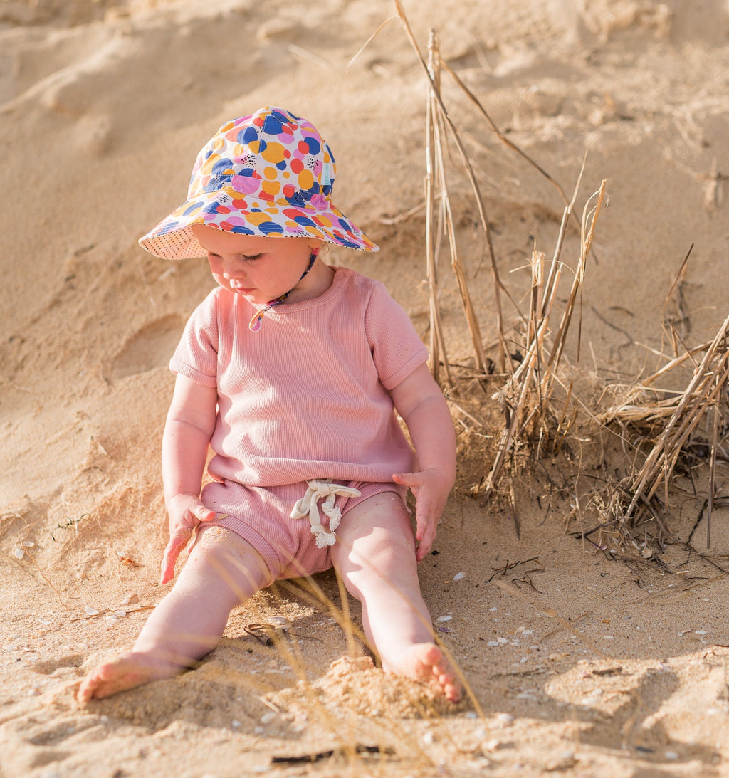The Confetti wide brim sunhat is for all those joyful colour obsessed kids out there. Featuring a stunning confetti print on the outside and a black and white polka dot print in the inner brim for a great contrast.
