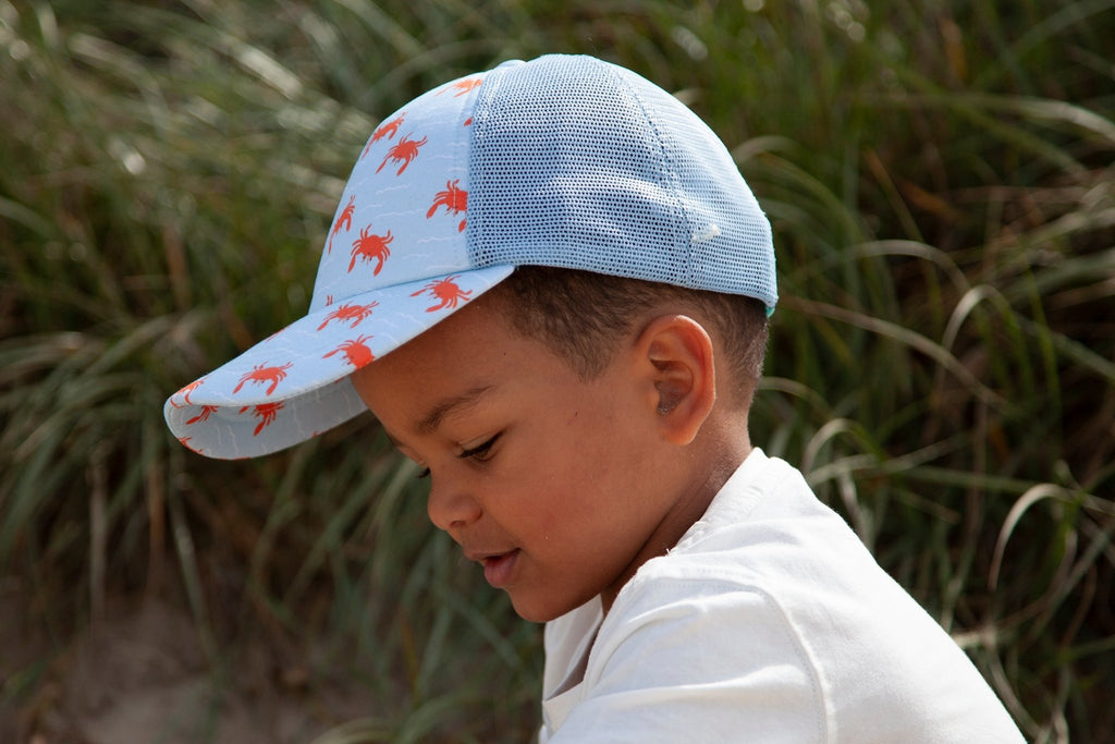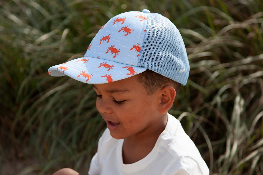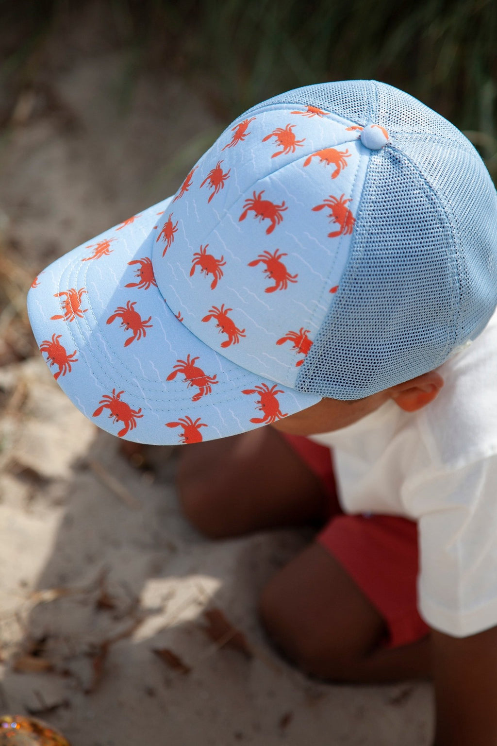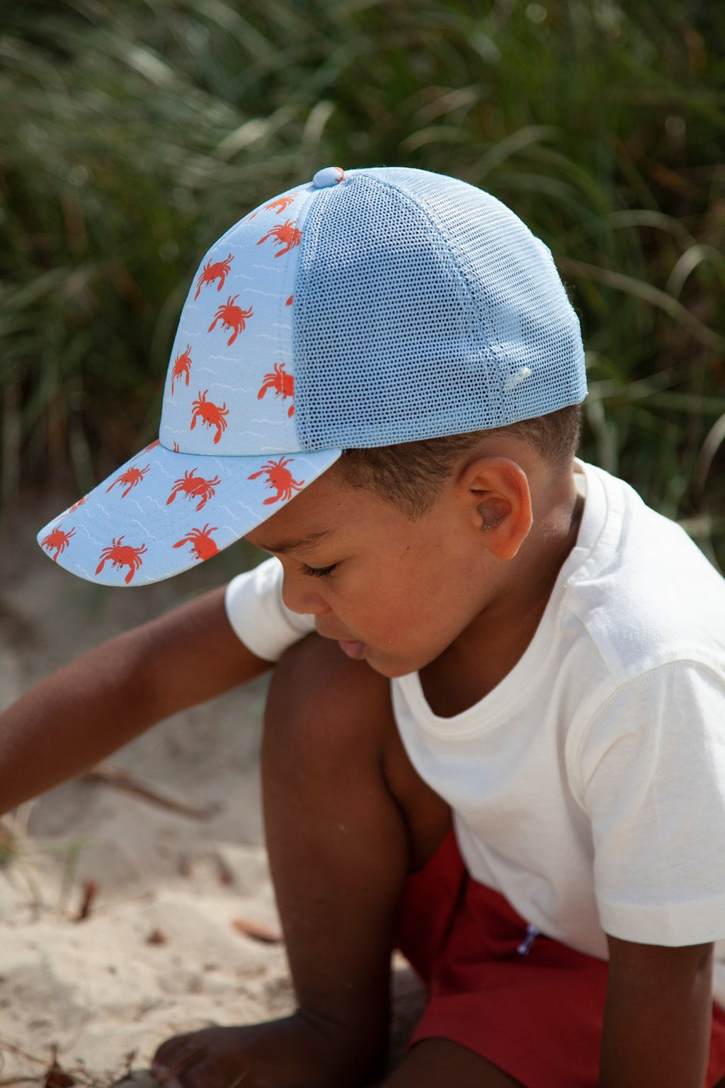The trucker cap features a crab print on the peak and visor, with adjustable snaps at the back for a perfect fit. Made from a blend of cotton, polyester, and nylon.
