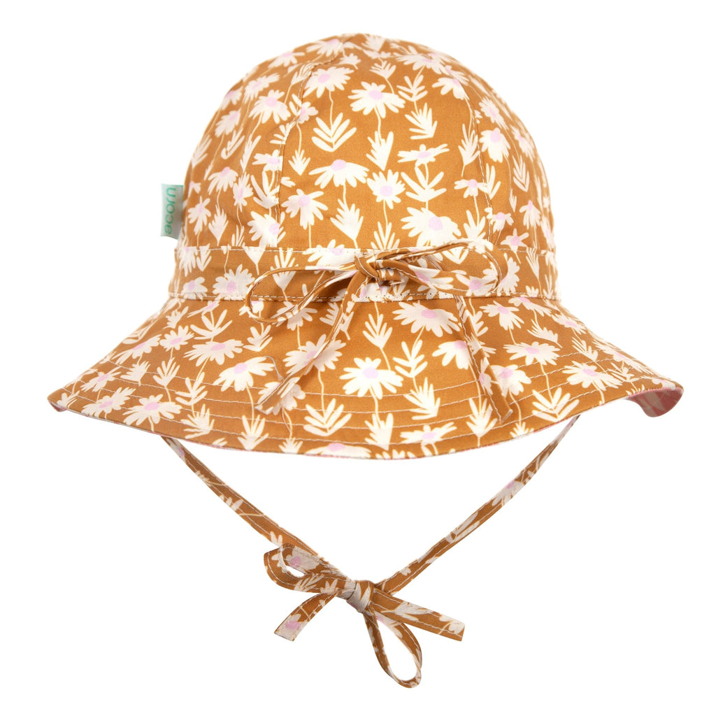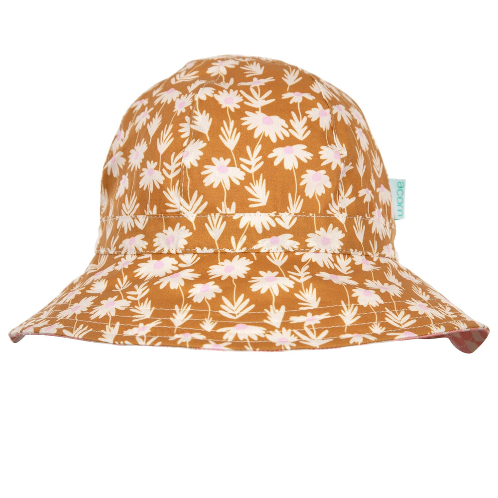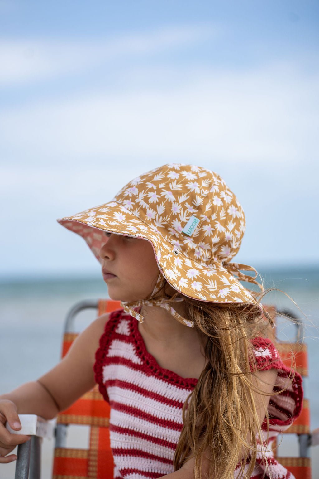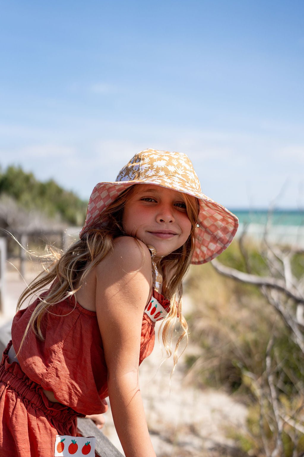 A gorgeous reversible wide brimmed sunhat with a golden daisies print on the outside and pink and cream checks design on the reverse, both prints are designed by Jacinta Weir from Two Little Ducklings.