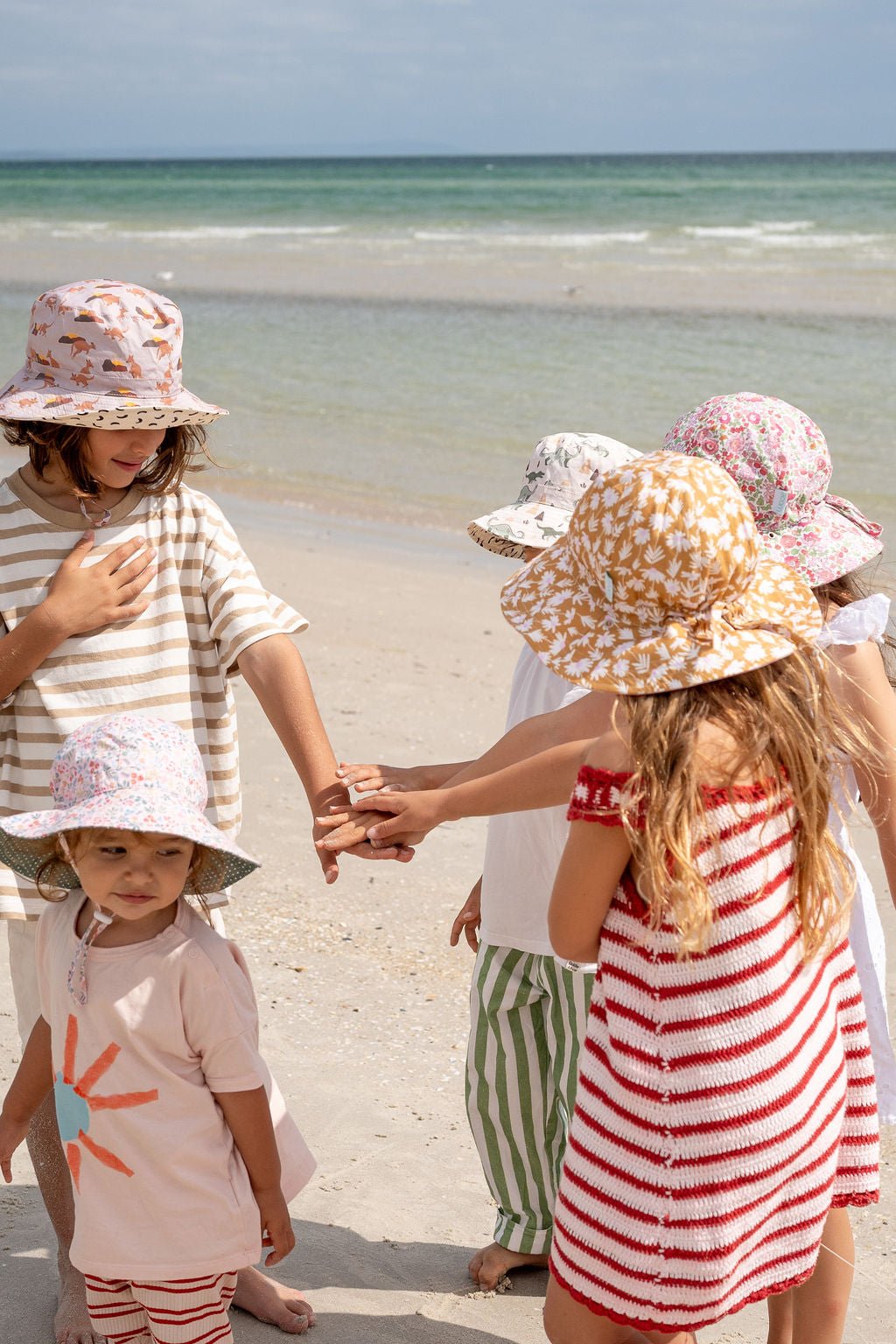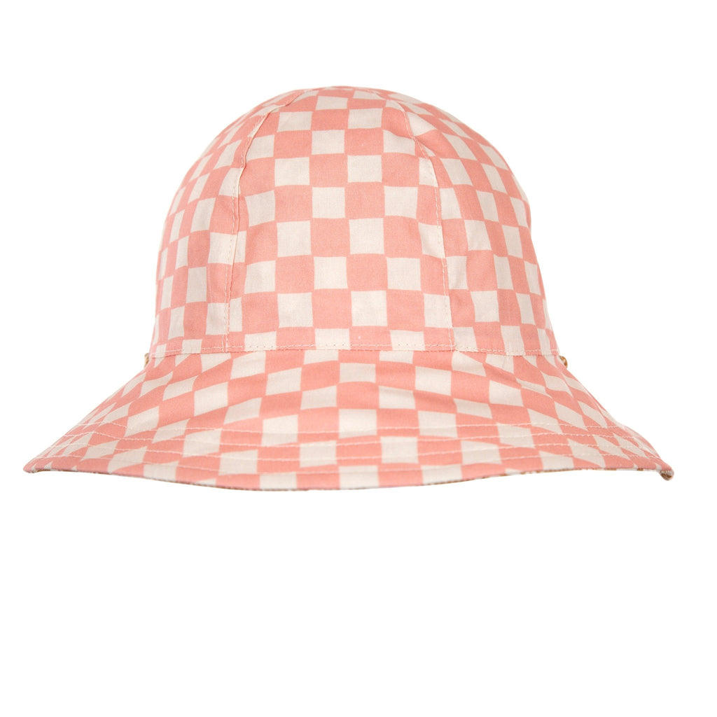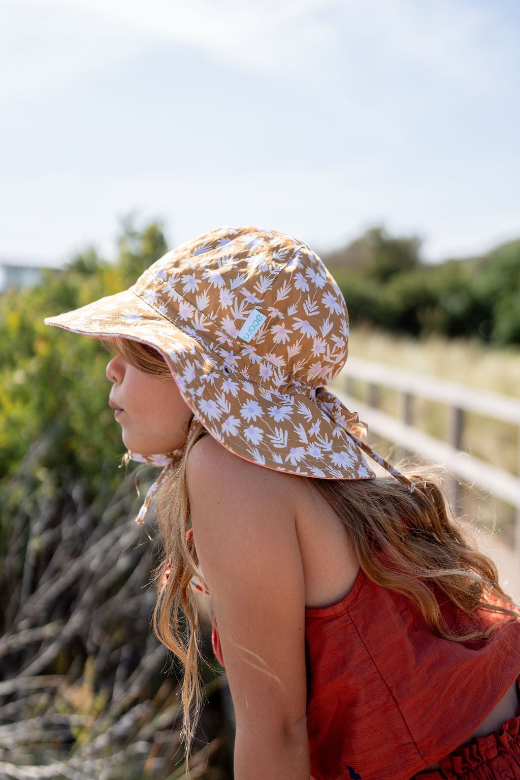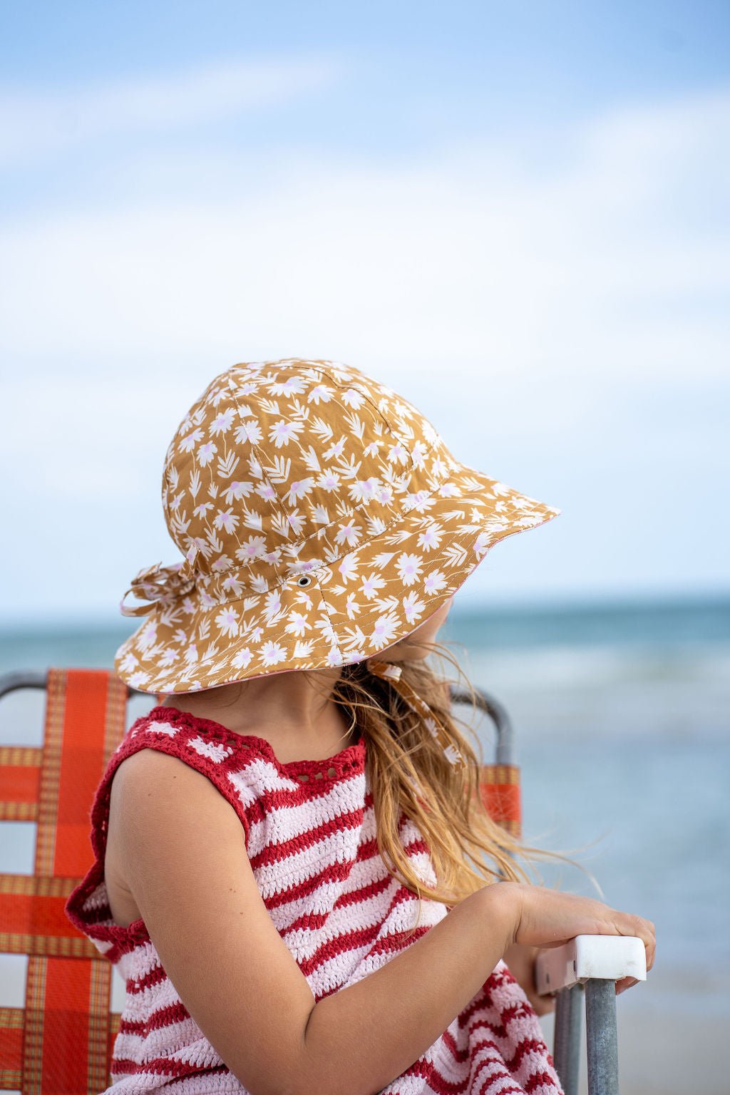 A gorgeous reversible wide brimmed sunhat with a golden daisies print on the outside and pink and cream checks design on the reverse, both prints are designed by Jacinta Weir from Two Little Ducklings.