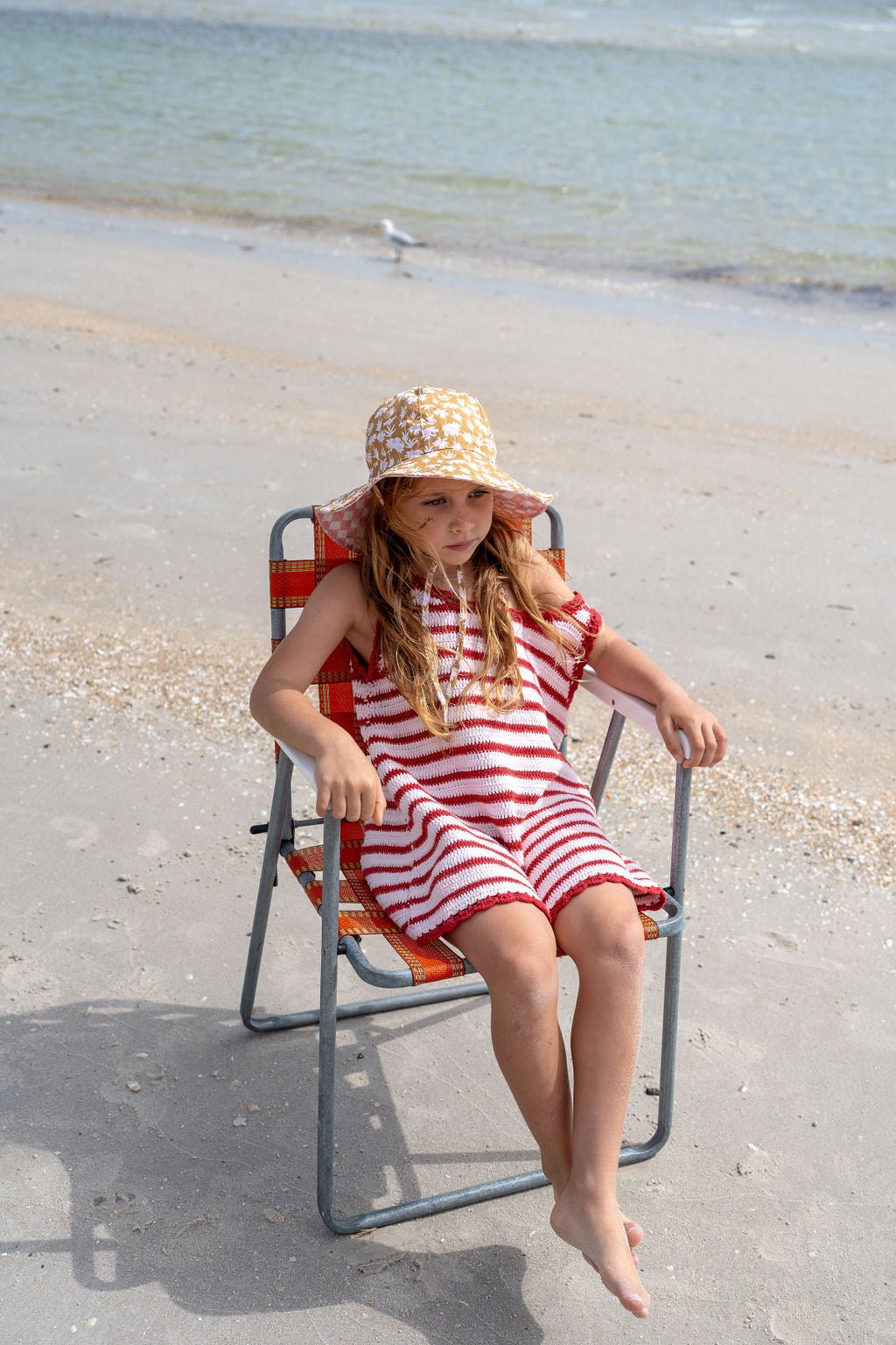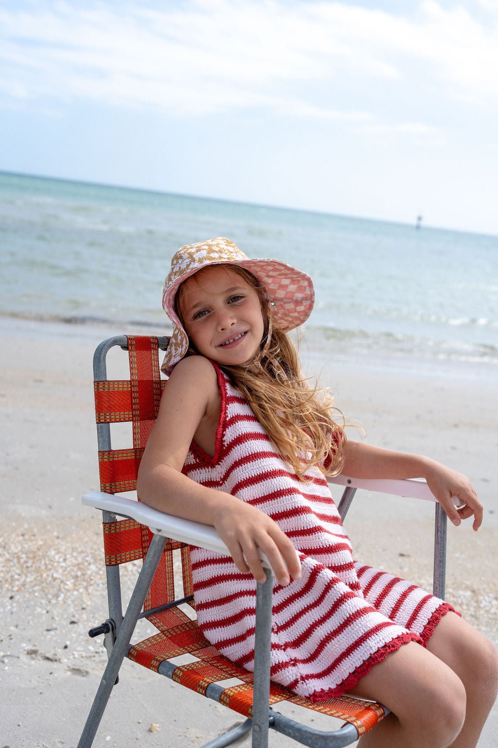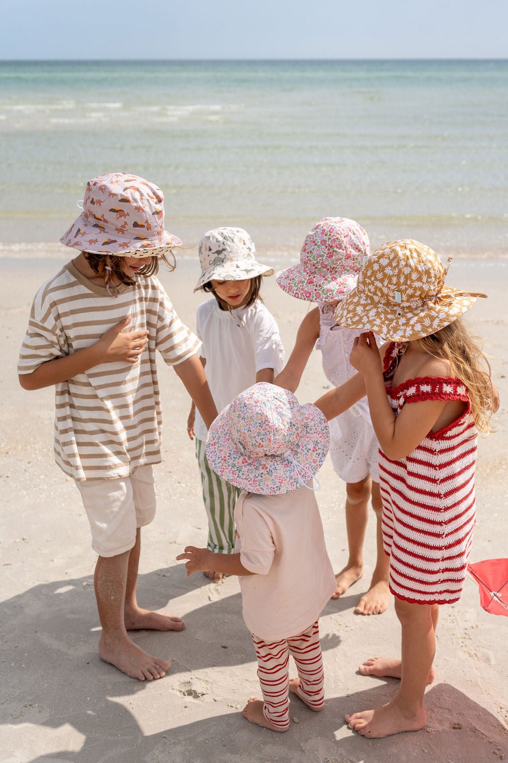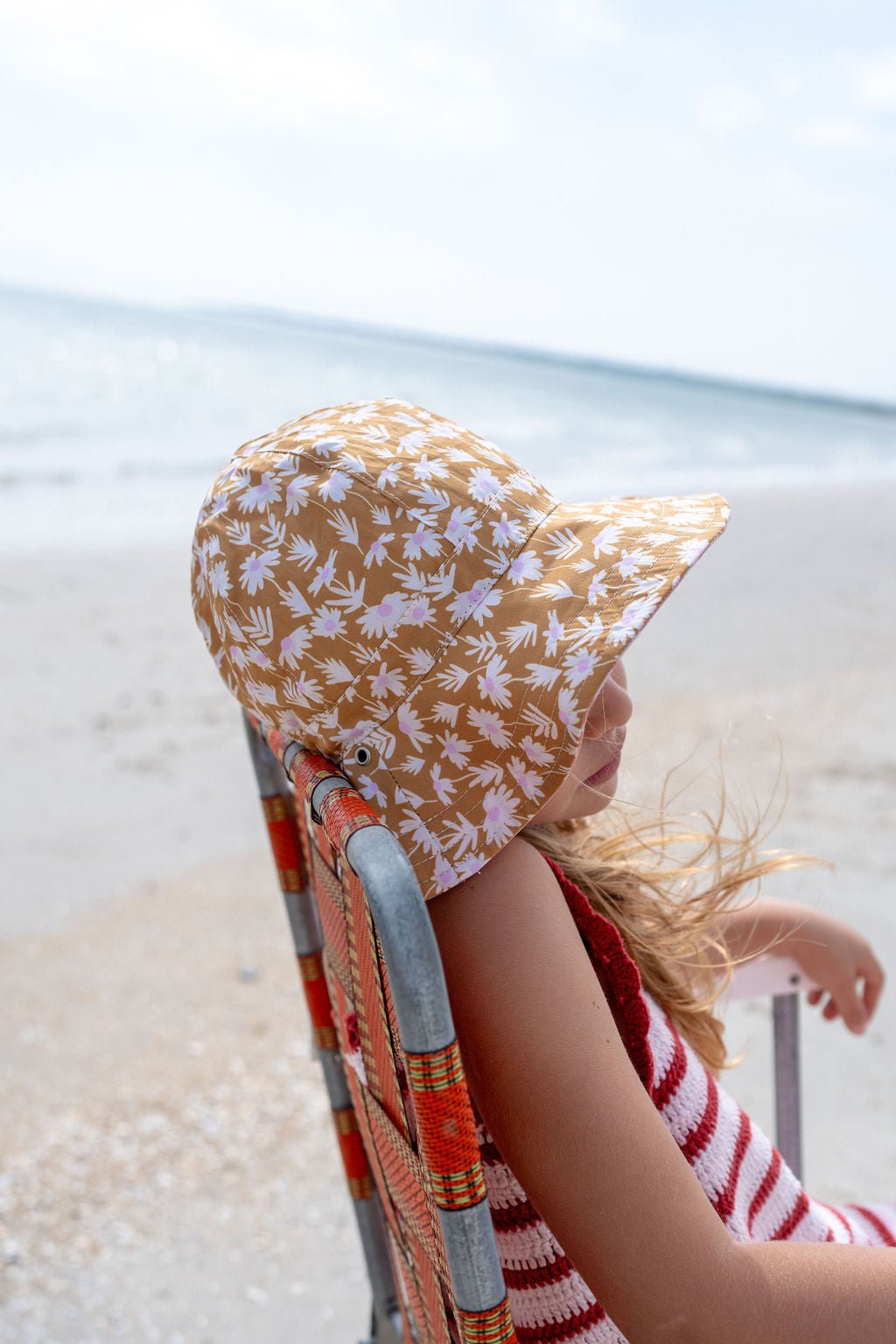 A gorgeous reversible wide brimmed sunhat with a golden daisies print on the outside and pink and cream checks design on the reverse, both prints are designed by Jacinta Weir from Two Little Ducklings.