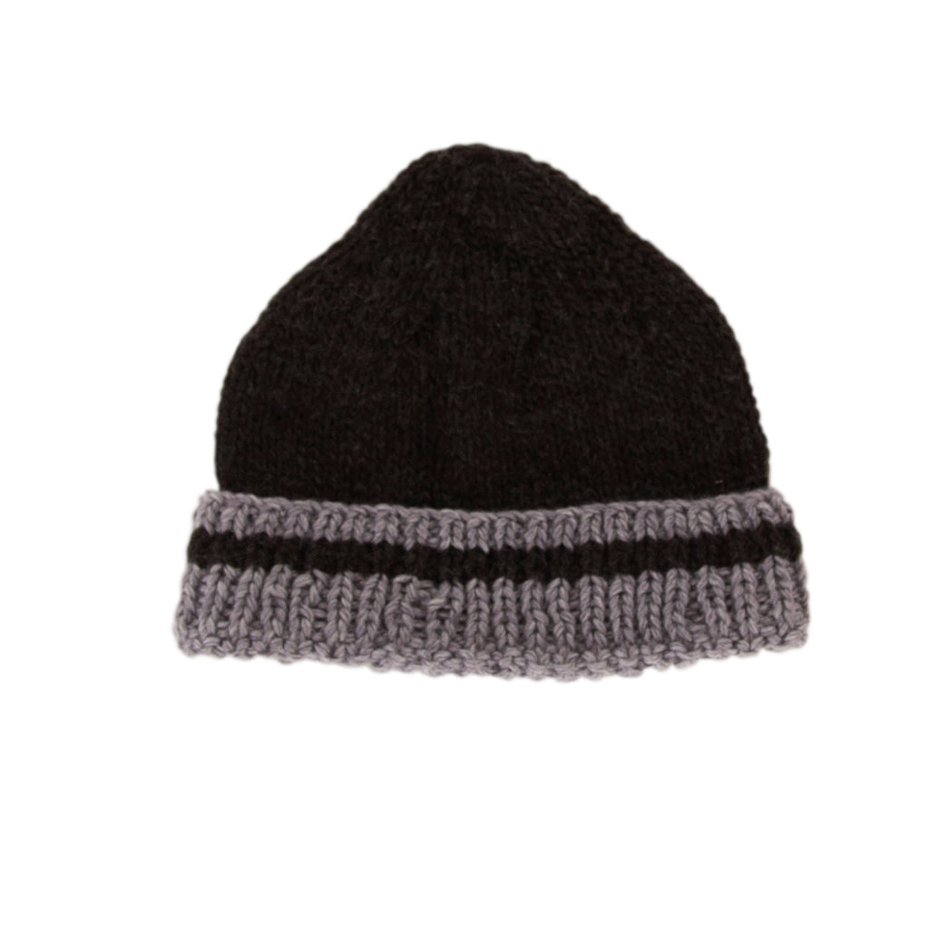 Lovingly hand-knitted with two toned striped rolled ribbing at the face and a pointed crown design.