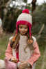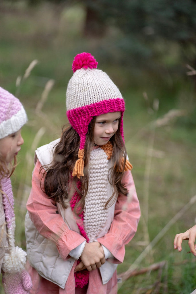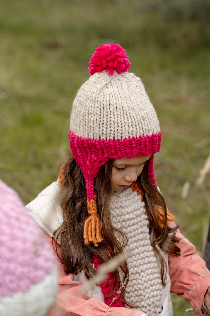 This super soft wool blend beanie is lots of fun with its two toned design as well as the contrast tip on the end of the side ties.