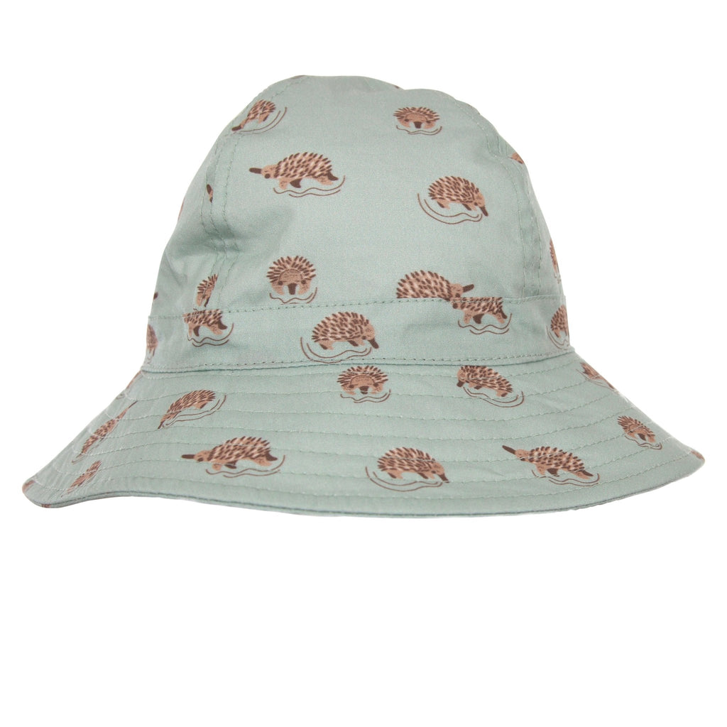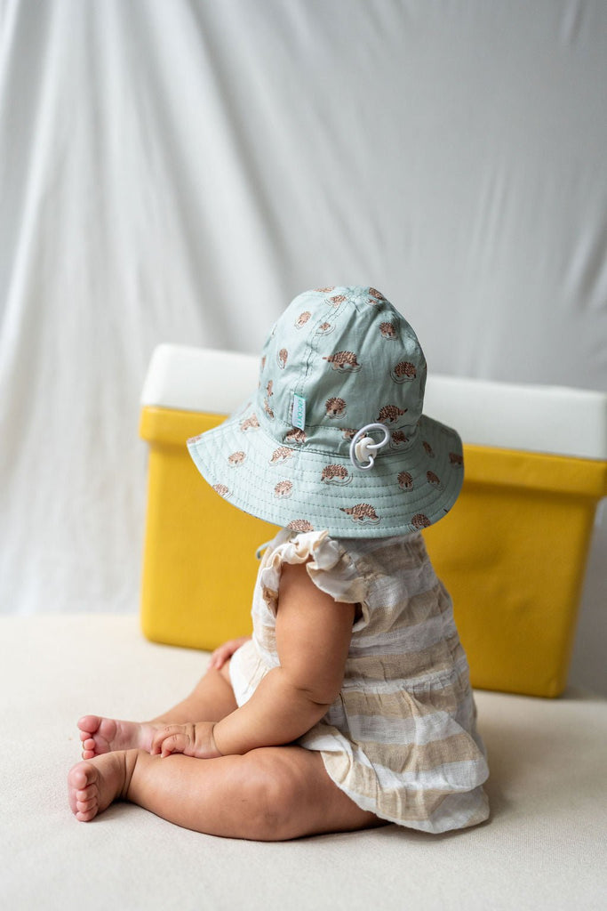 Baby sun hat with a fun Echidna print designed in Melbourne by Jacinta Weir from Two Little Ducklings.