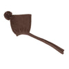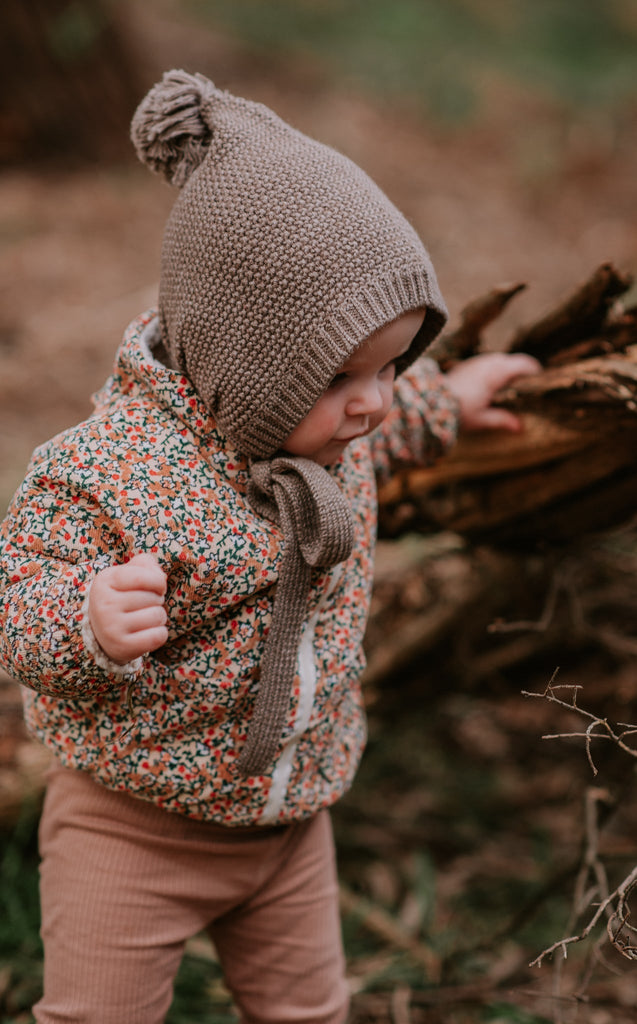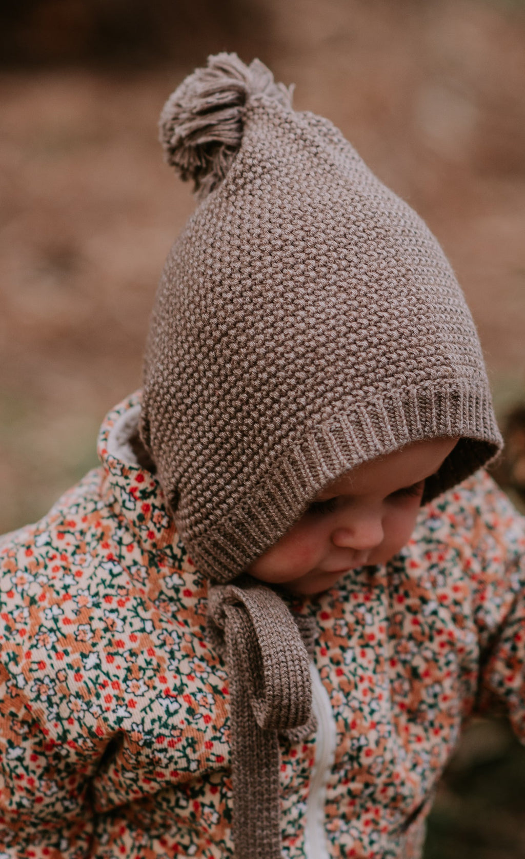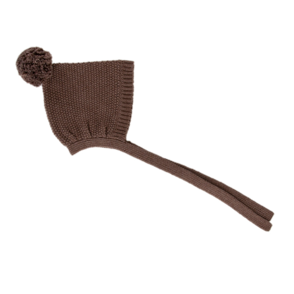 Made from the softest pure wool with a pixie shape, a lovely textured moss stitch pattern, long side ties and a pom pom on top.