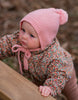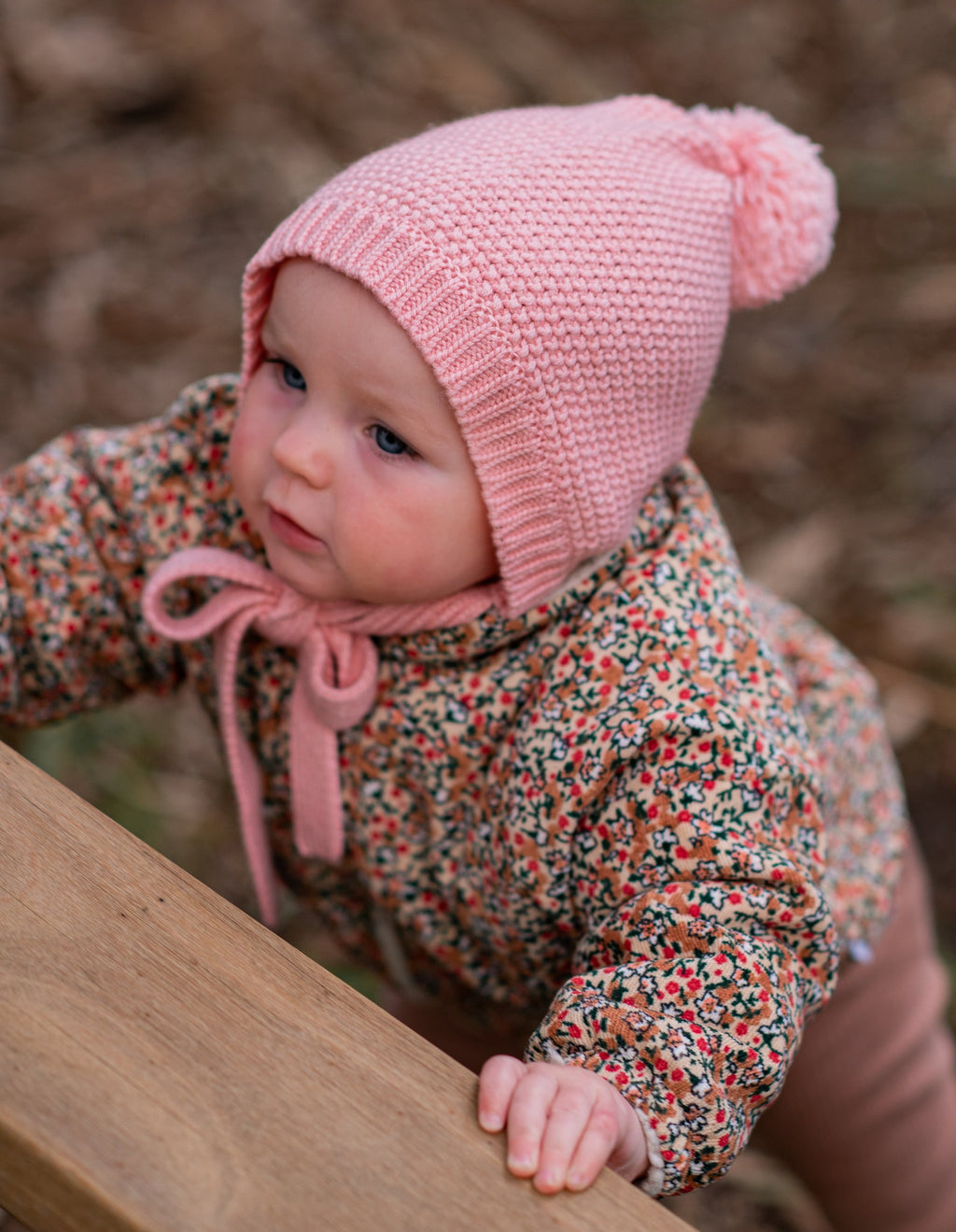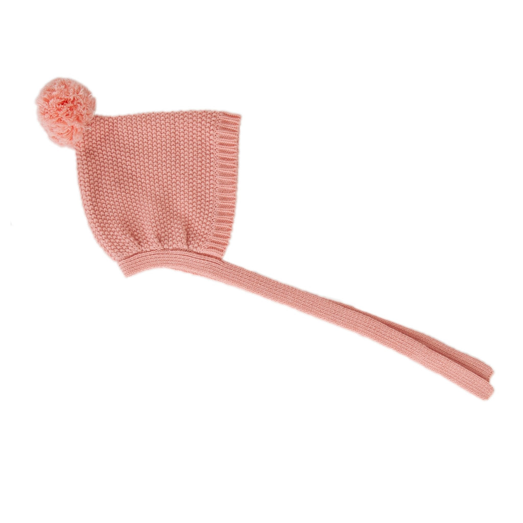 Made from the softest pure wool with a pixie shape, a lovely textured moss stitch pattern, long side ties and a pom pom on top.